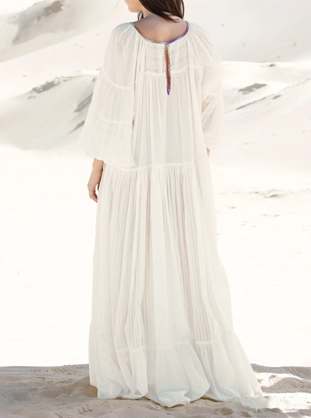 Its neckline is enhanced by a colorful border, adding a vibrant and refined touch. The long, flowing sleeves float lightly, reinforcing its airy charm. At the back, a cascade of layered ruffles falls gracefully, bringing fluidity and movement to the silhouette.