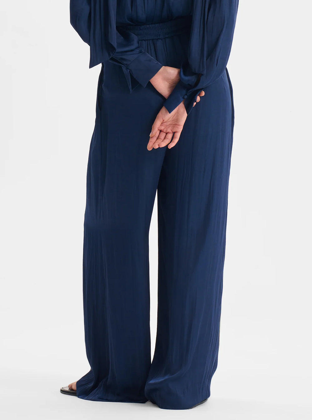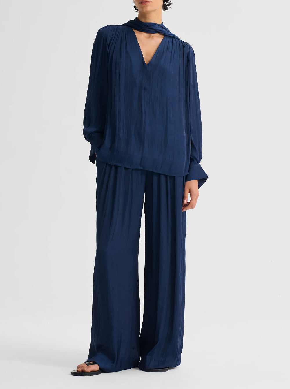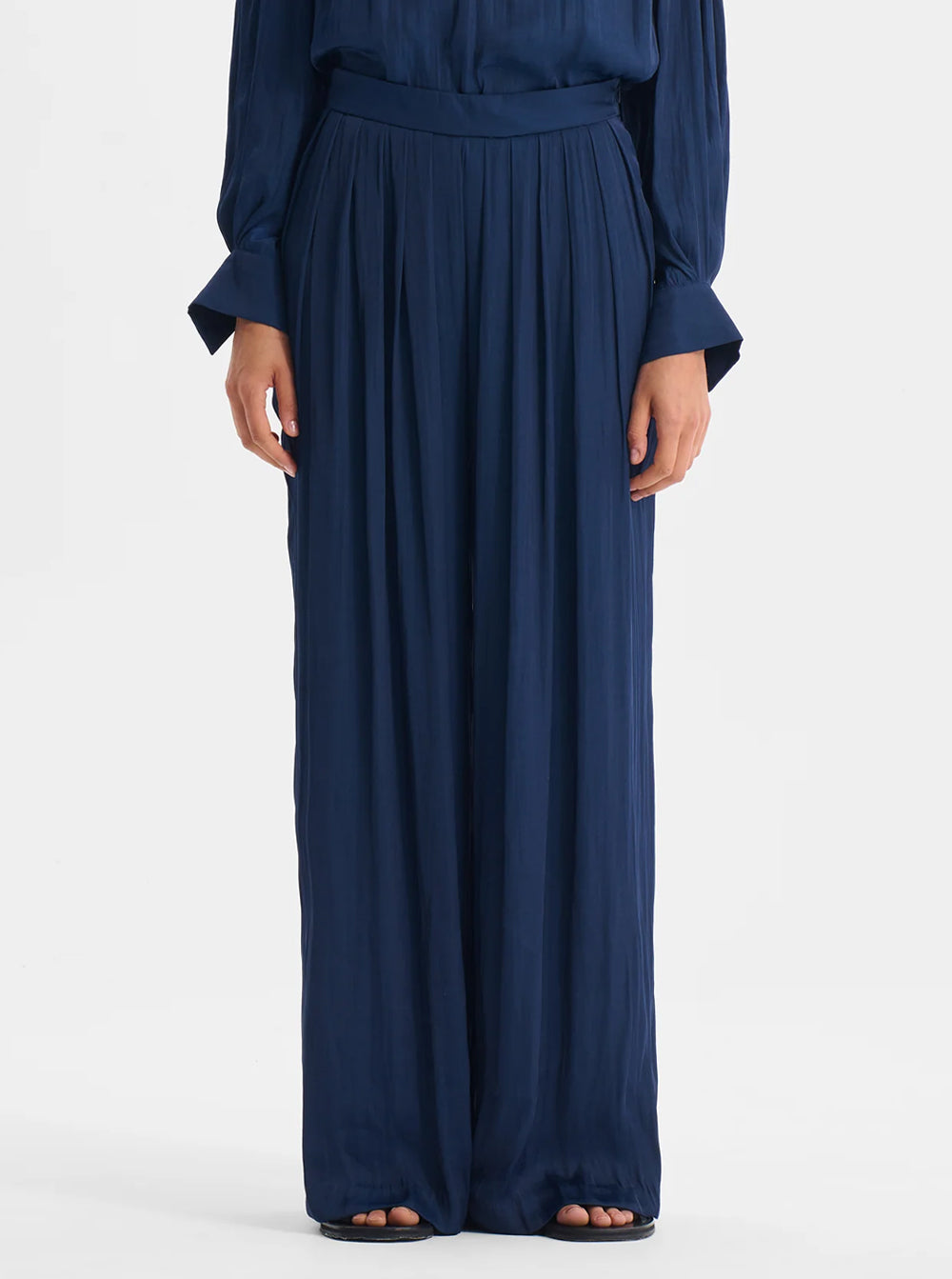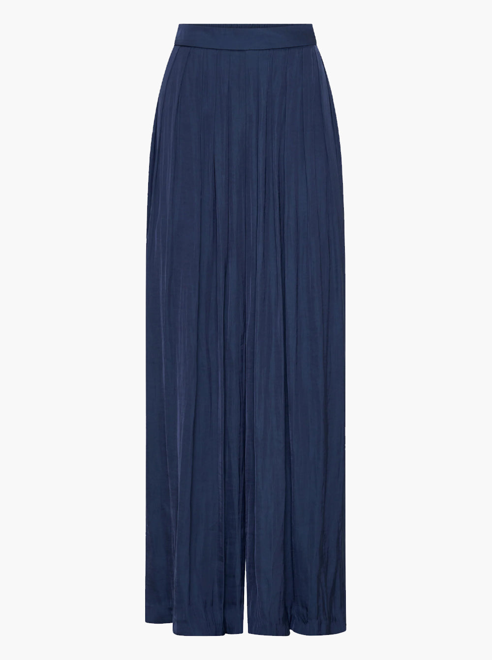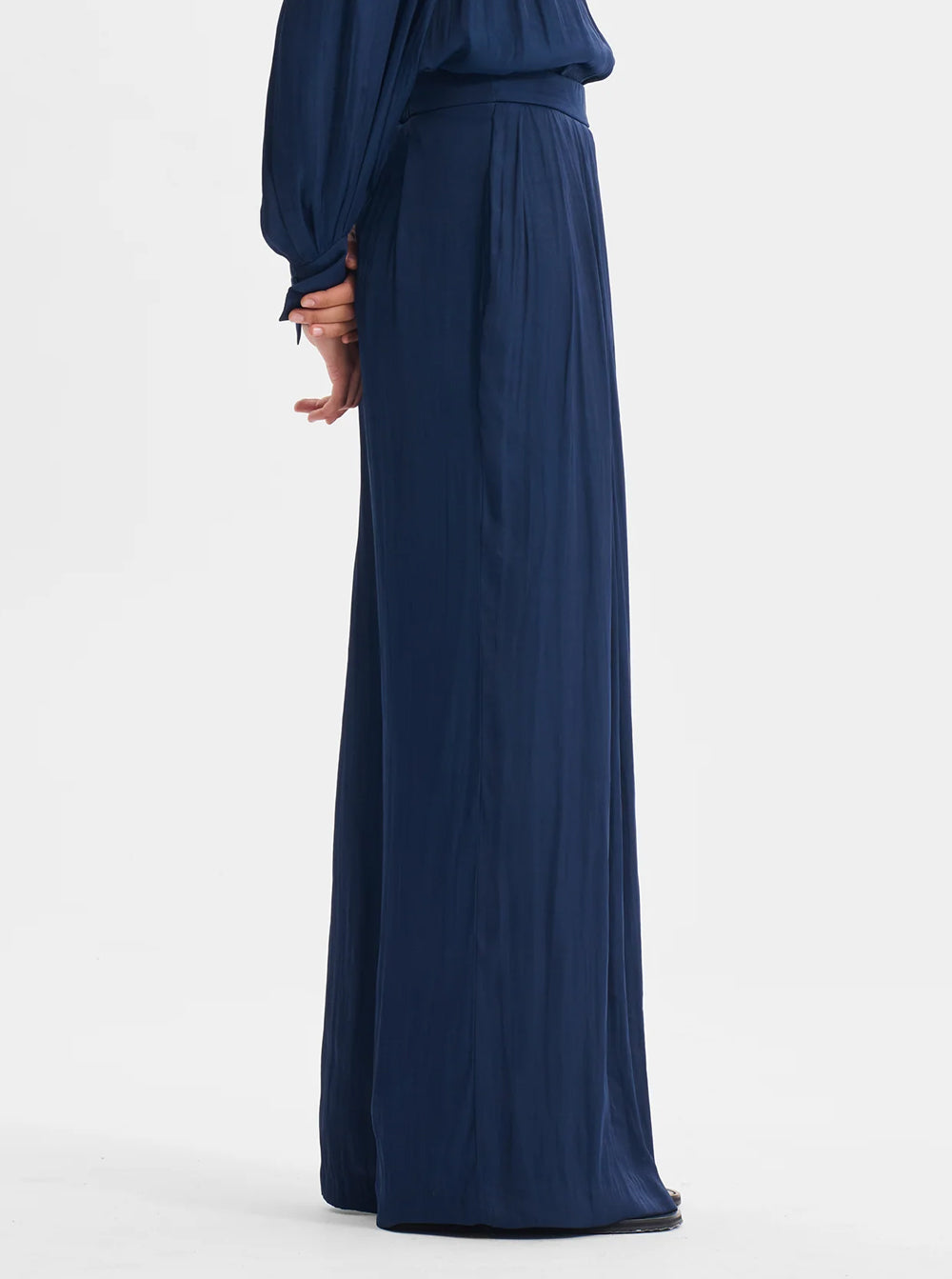 The Lena Pant features a high rise waist, flattering front tucks, and a wide leg silhouette for a sleek, modern look.