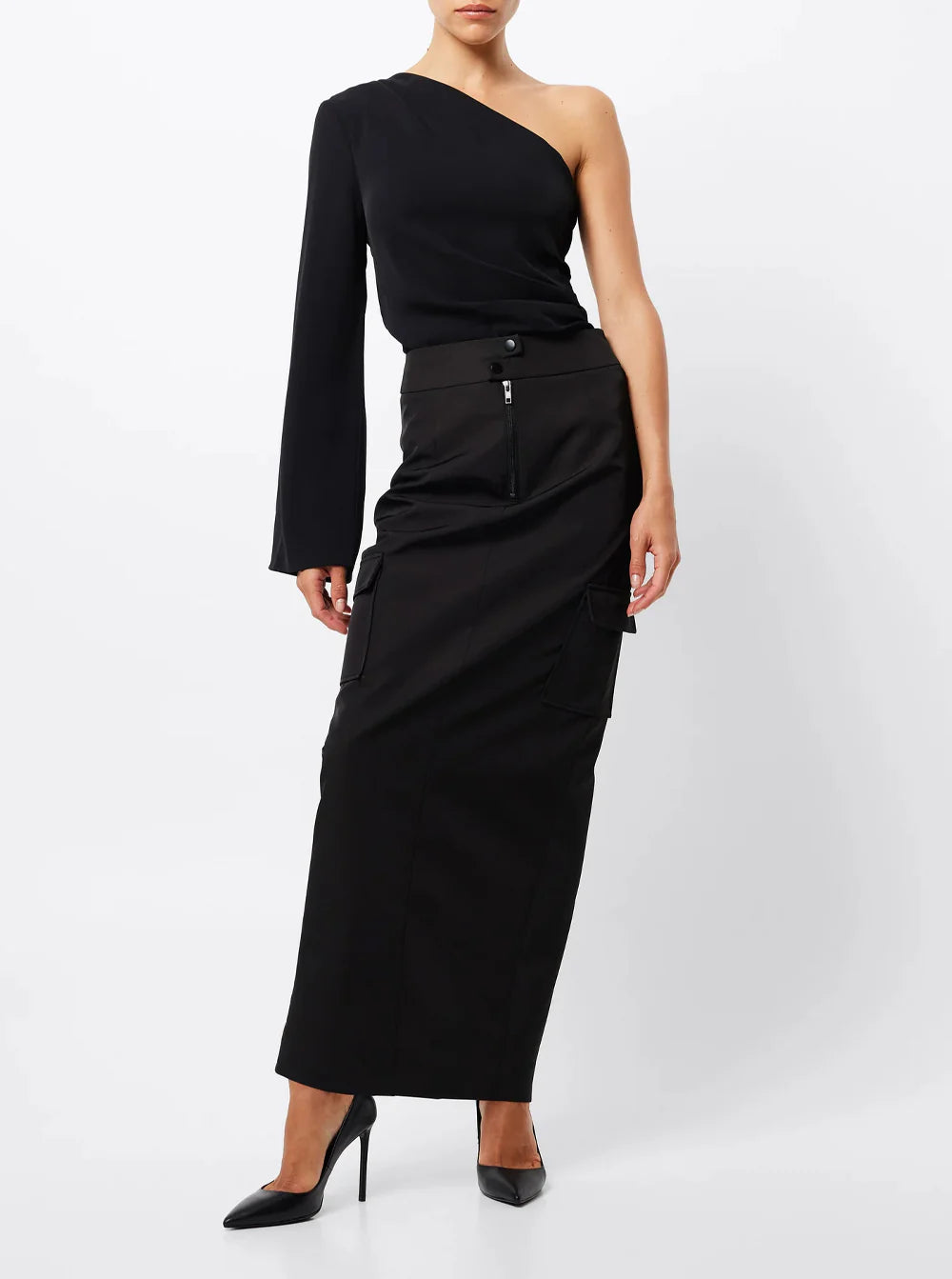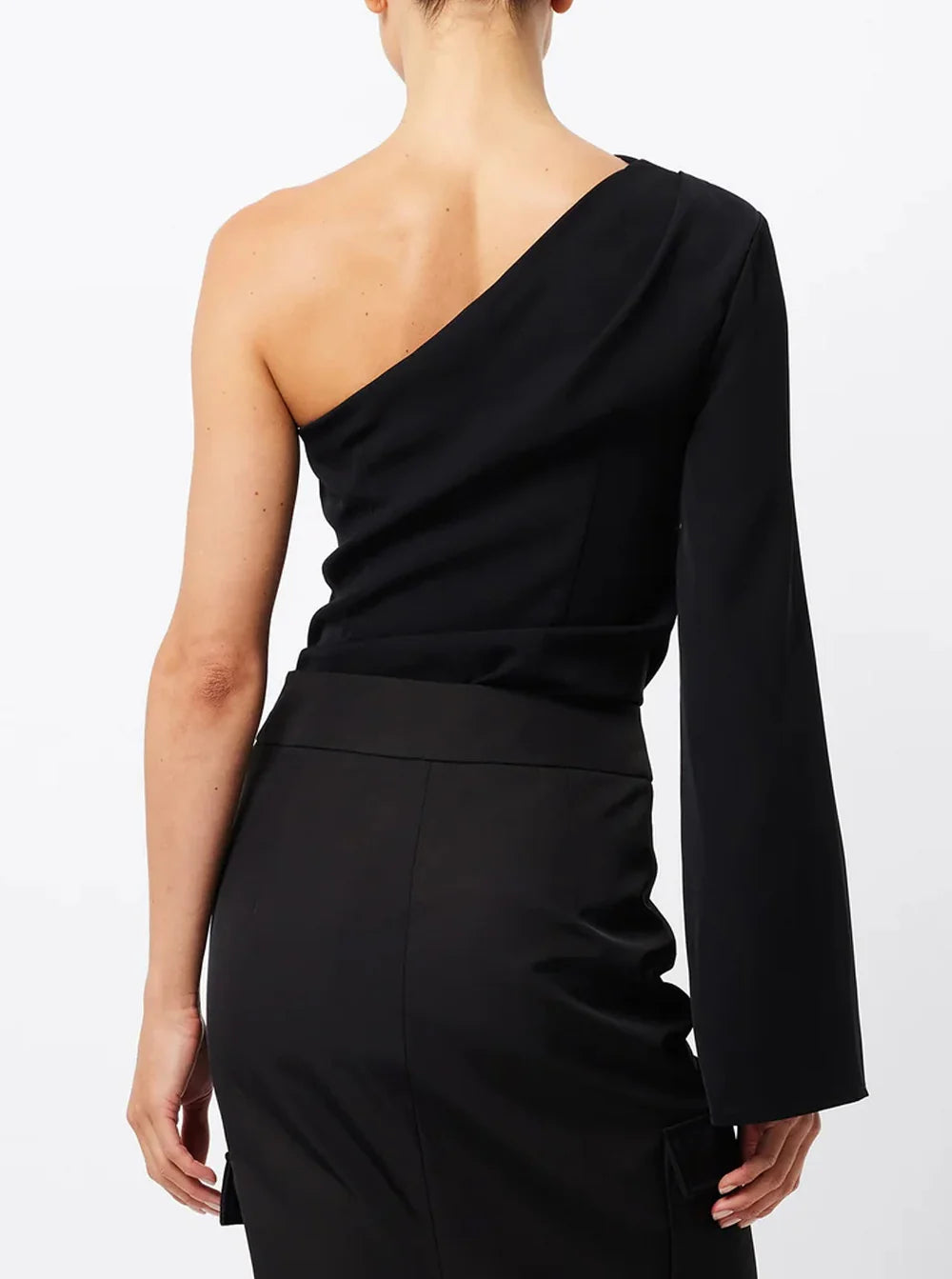 The Novel Top in Black has a striking one shoulder design with flattering side ruching. It's the perfect choice for adding a touch of sophistication to any outfit..