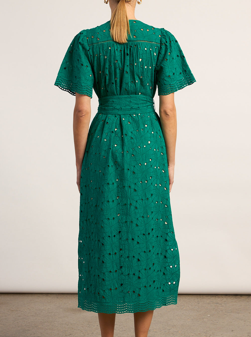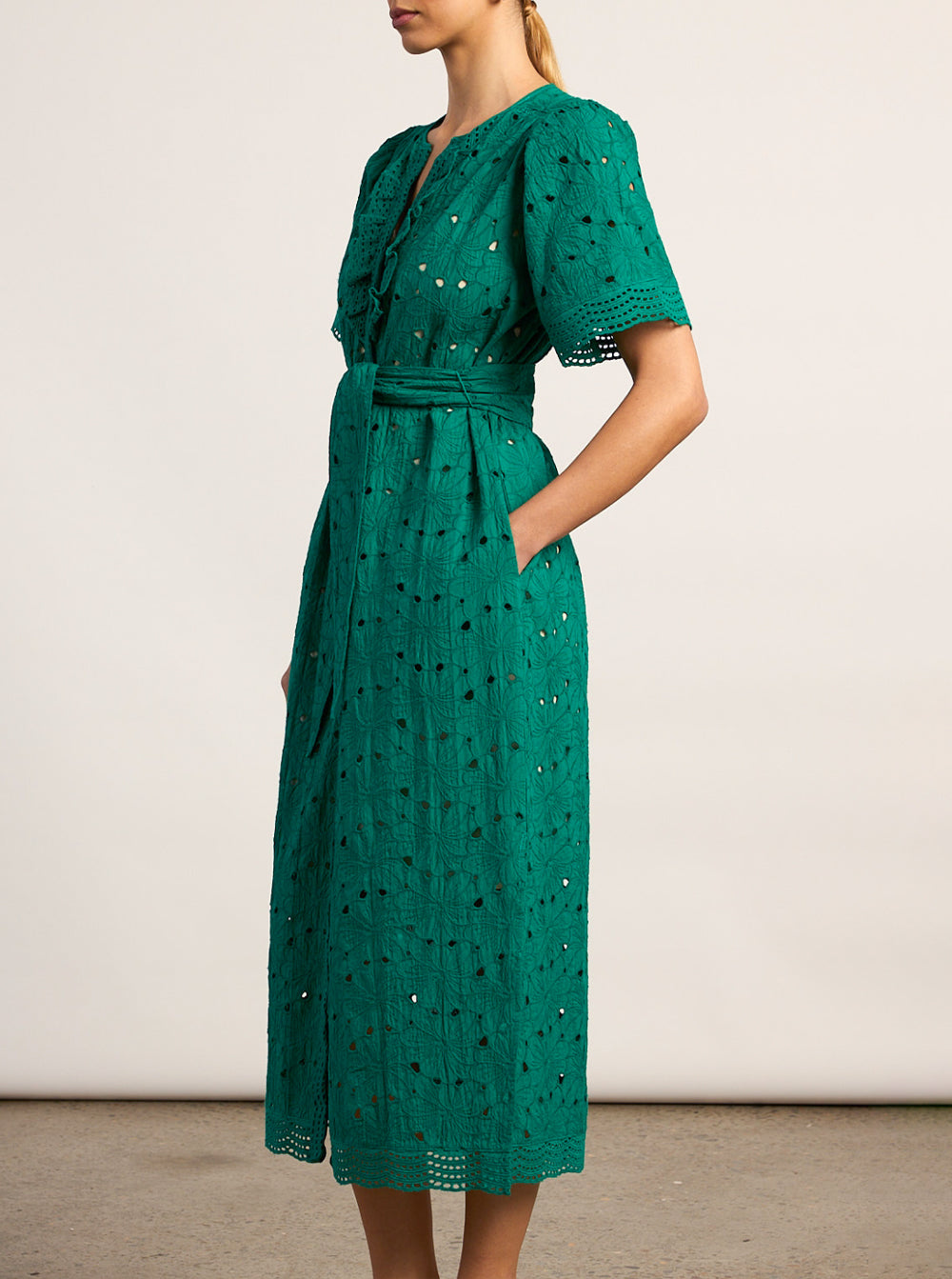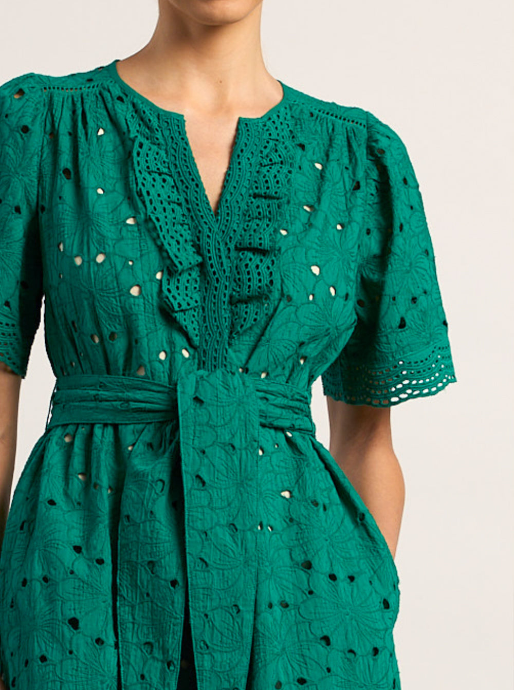 The Voyage Dress is shaped with a rounded neckline edged in lace ruffles and falls to a midi length with side splits for ease. A colour-matched cami provides coverage beneath the floral-inspired broderie, while a wide self-tie belt refines the waist.