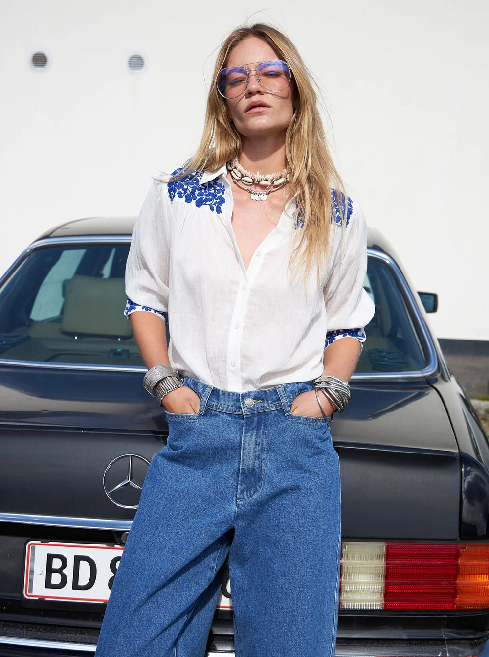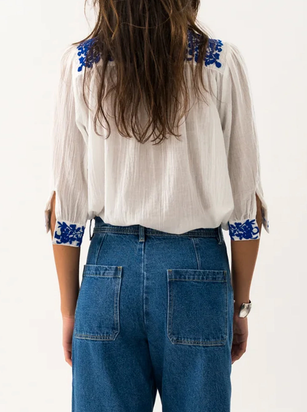 - Beautiful, hand-stitched blue floral embroidery on shoulders, back, and wide cuffs