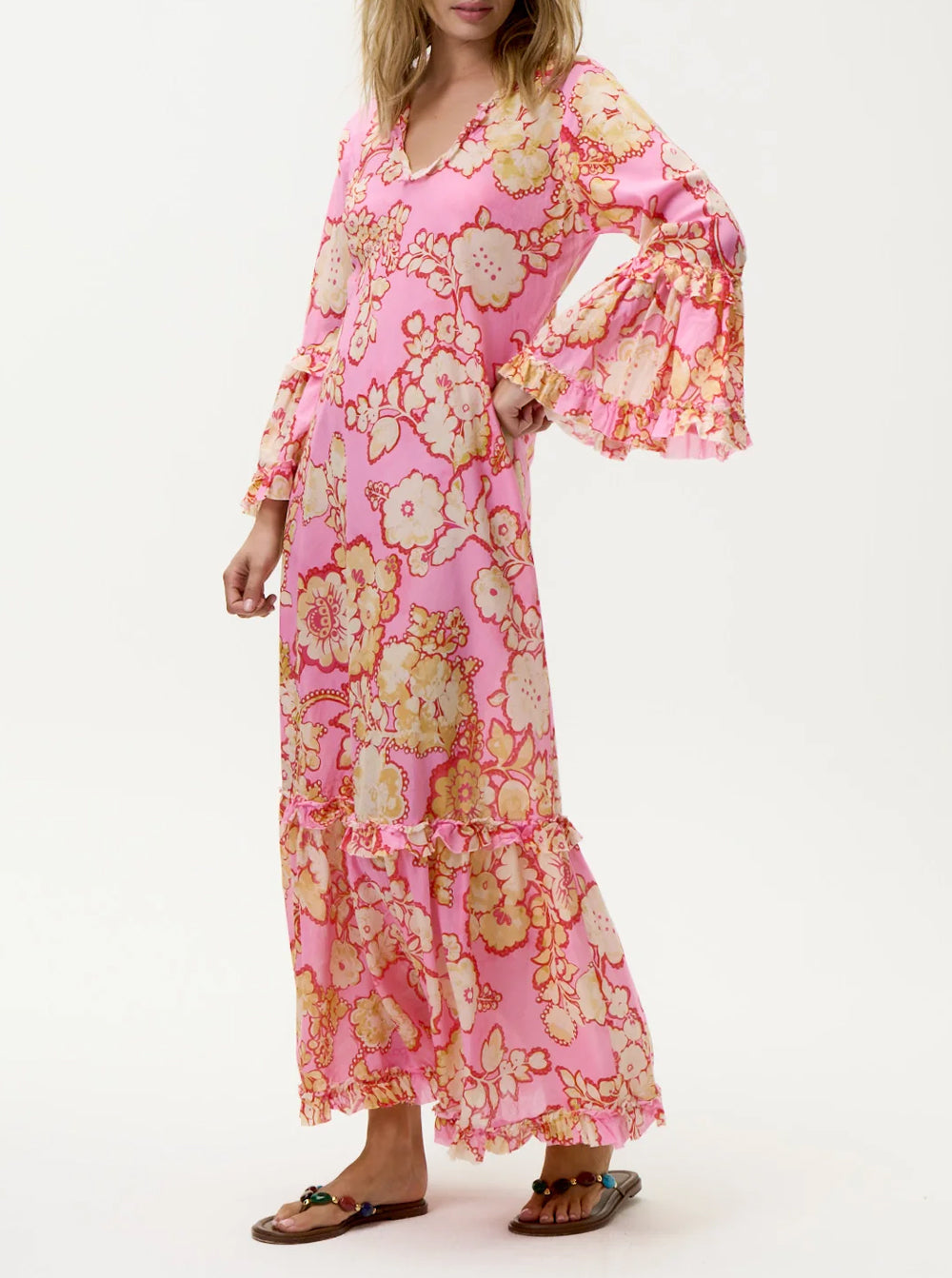The bias-cut dress, flowing fit, jumbo frills and accentuated sleeves make it effortless by day and a centrepiece by night.