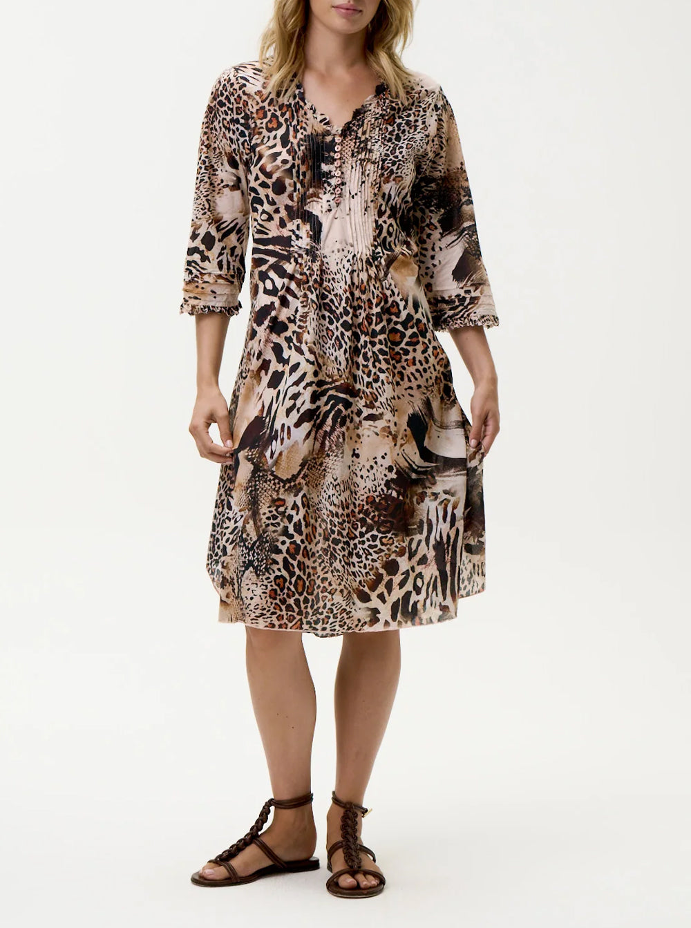 It’s finished with delicate raw ruffles around the neckline and sleeves and sits just below the knee.