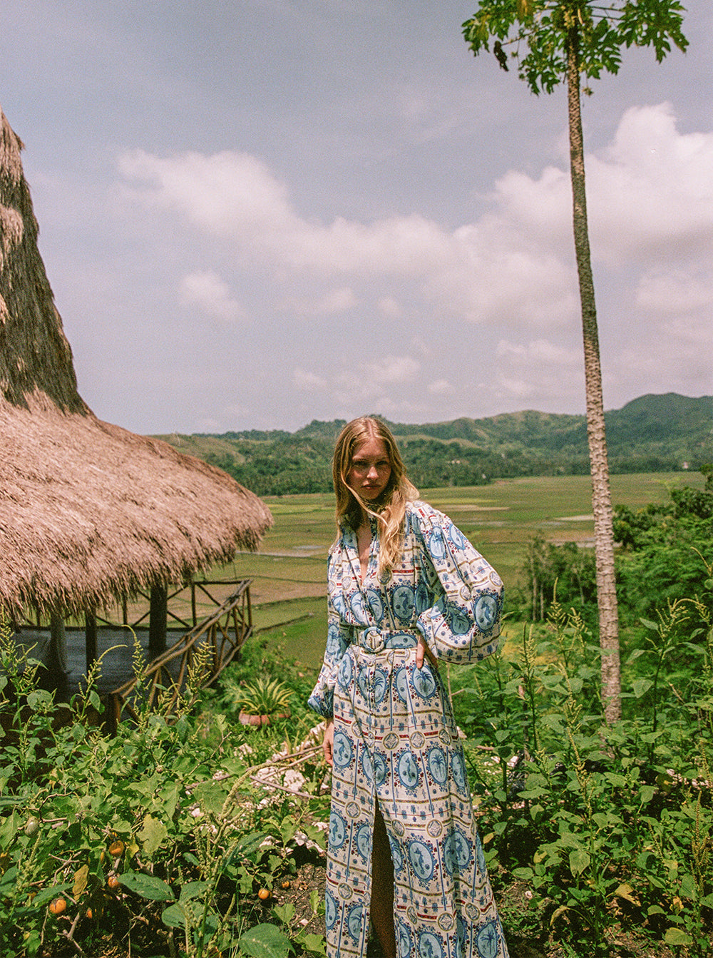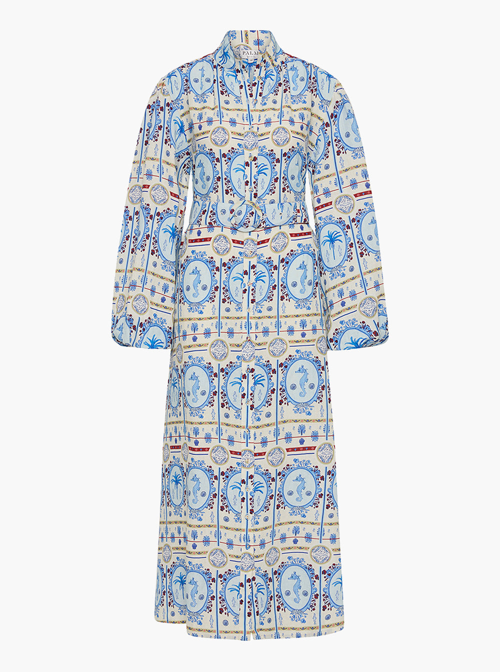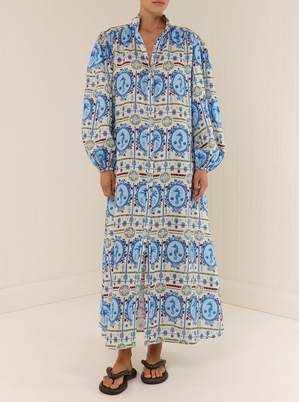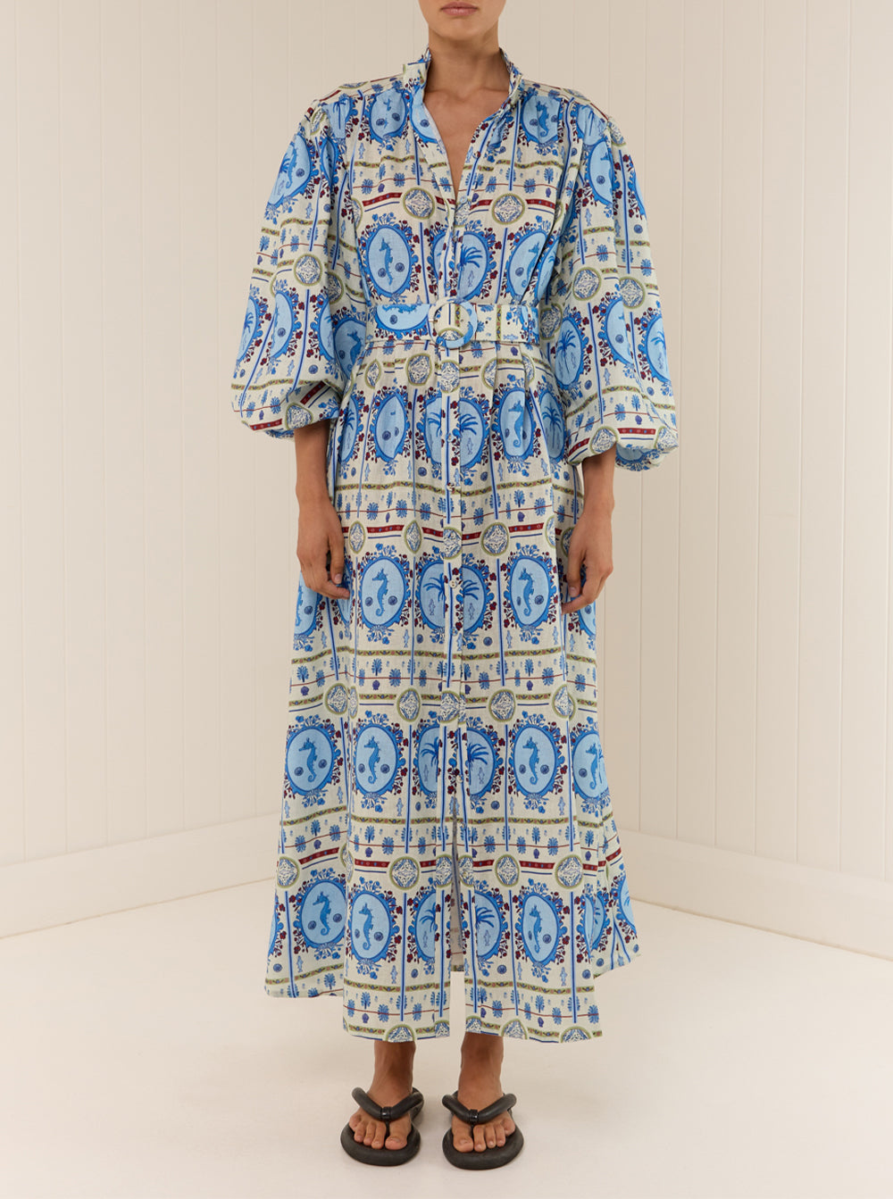 The Noddy Dress is designed as a relaxed maxi dress silhouette. Featuring blouson sleeves with elasticated cuffs, a stand collar and centre front button detailing. The Noddy Dress is designed to hang loosely from the body, and has a matching buckle belt to bring in the waist.