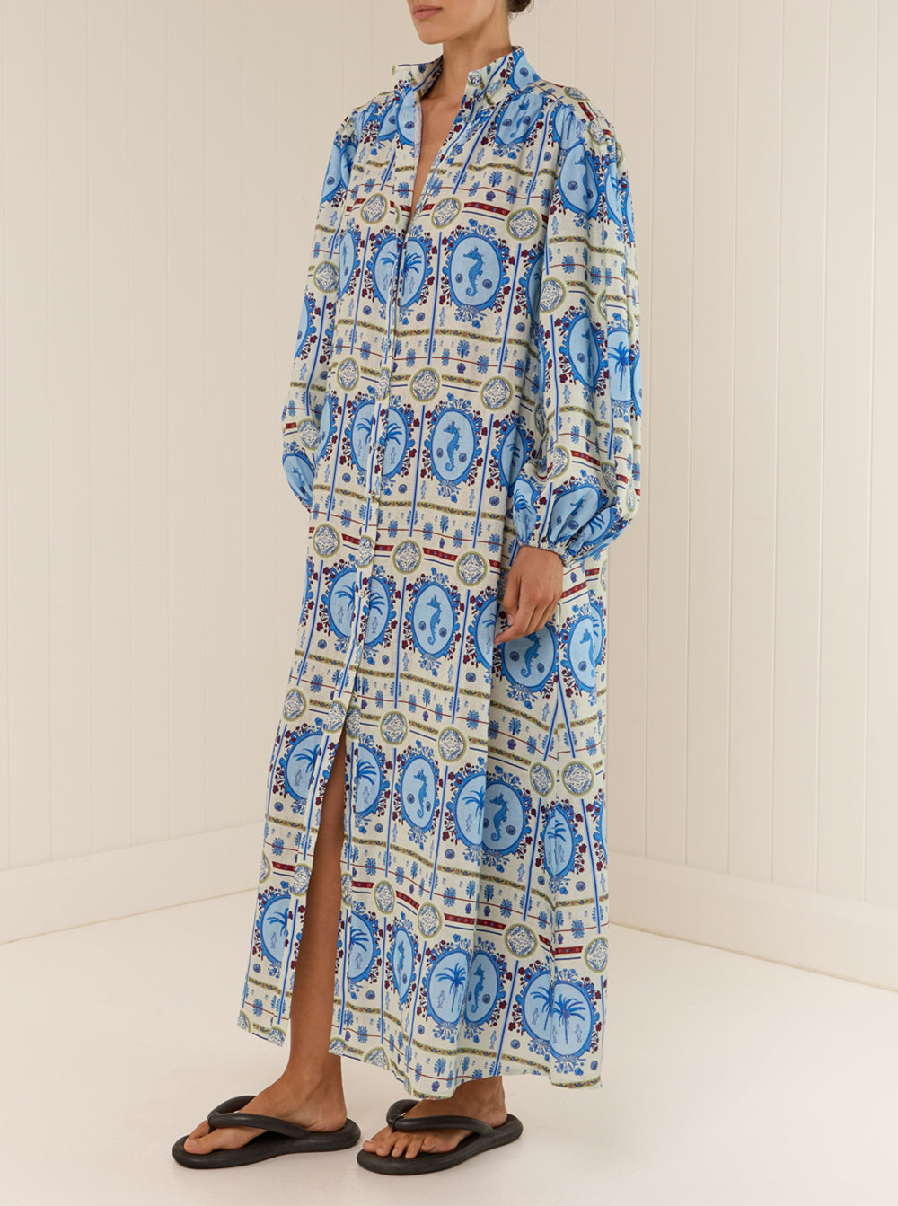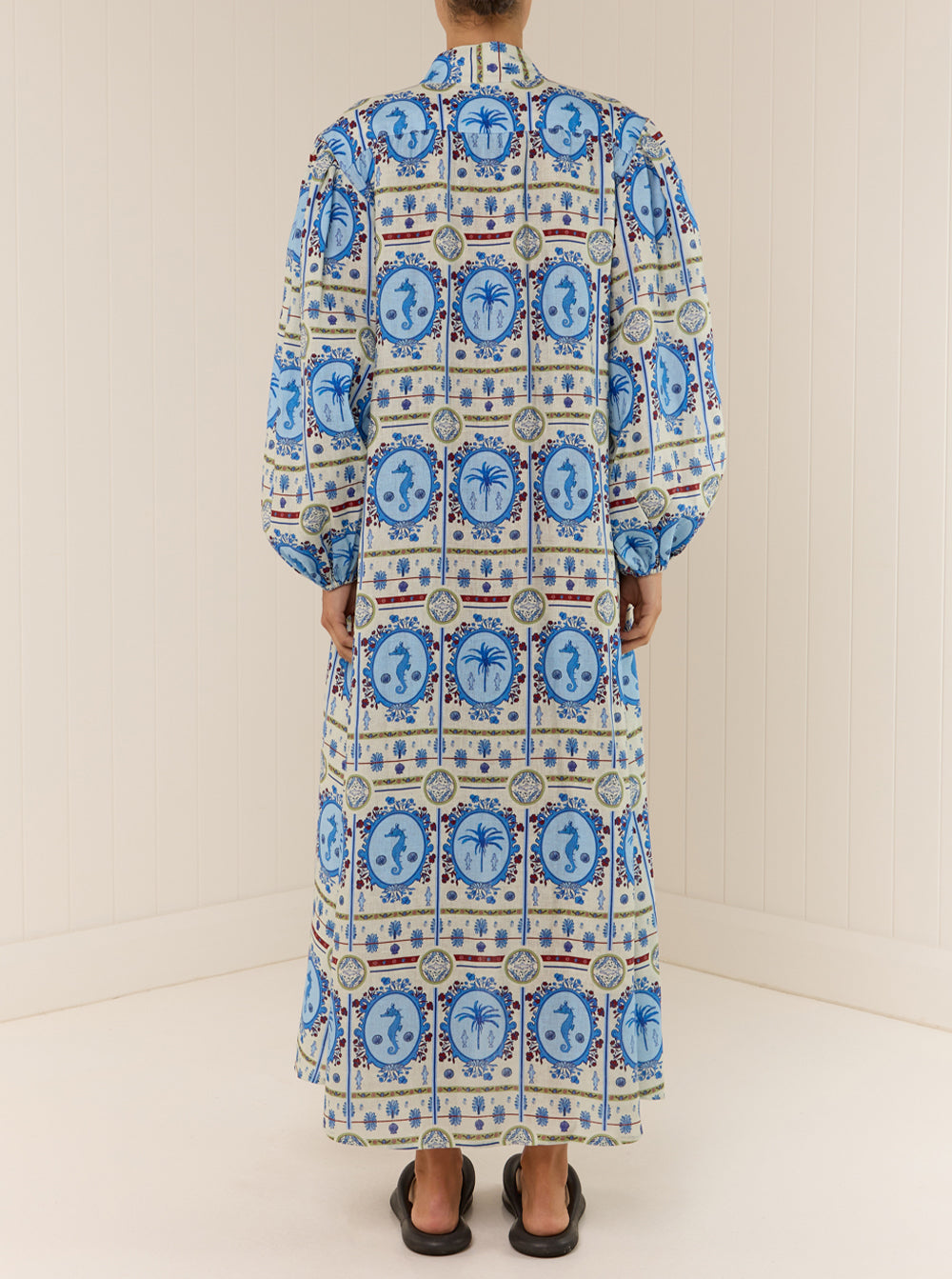 The Noddy Dress in Palm. Noosa's exclusive Lagoona Tile print is crafted in a premium linen.