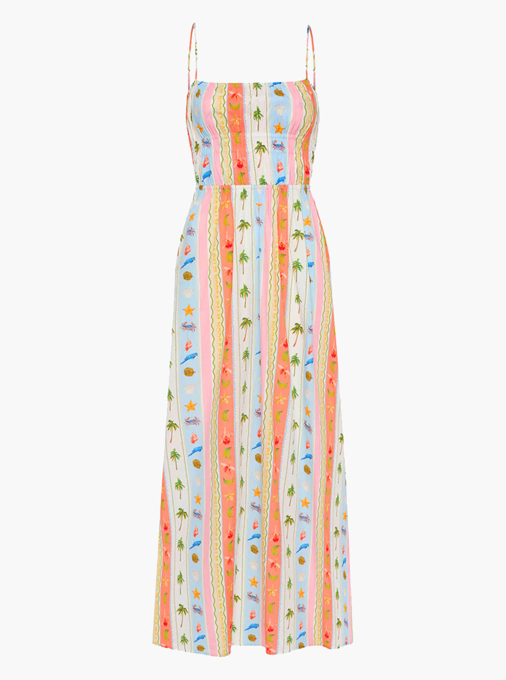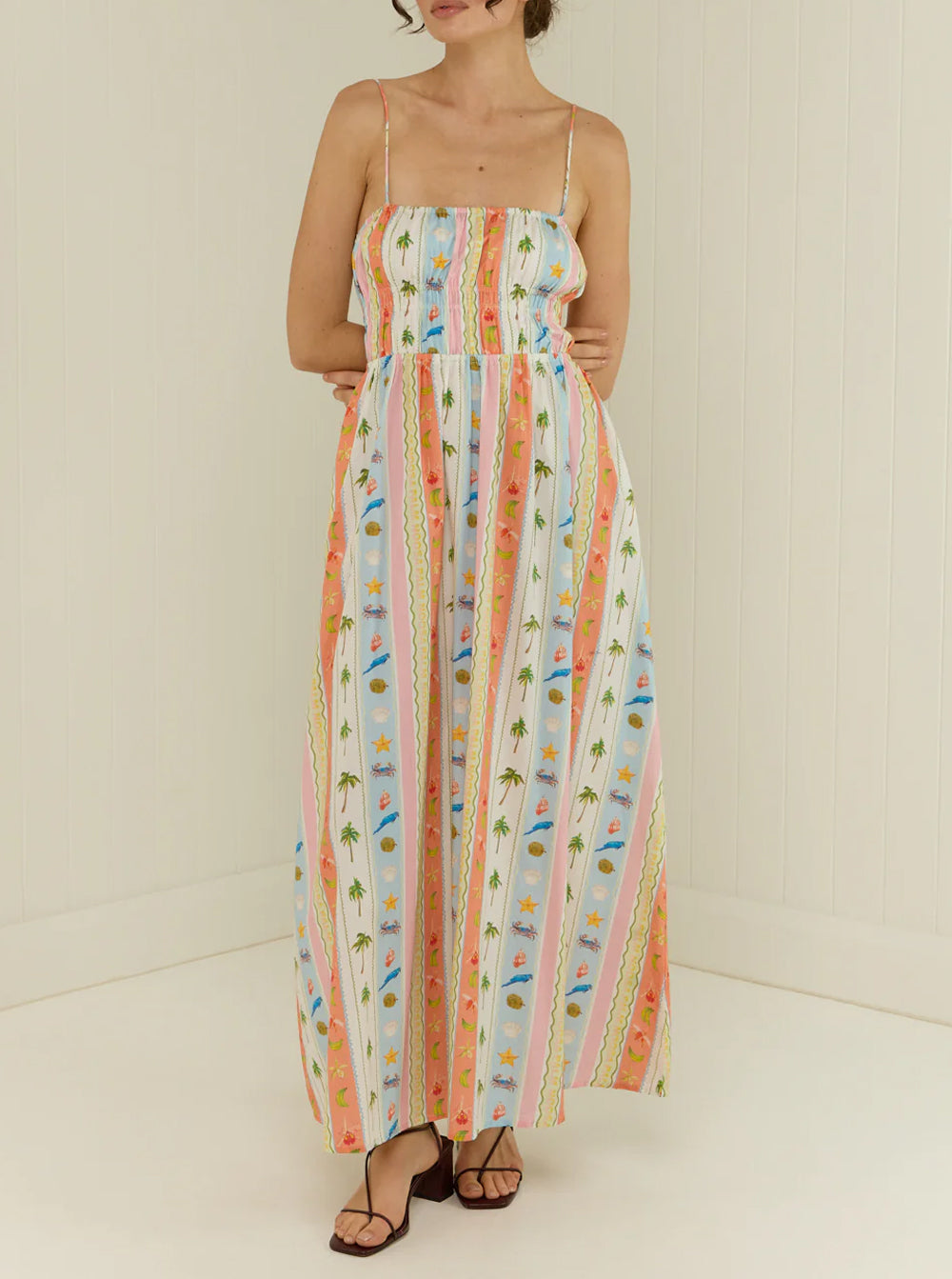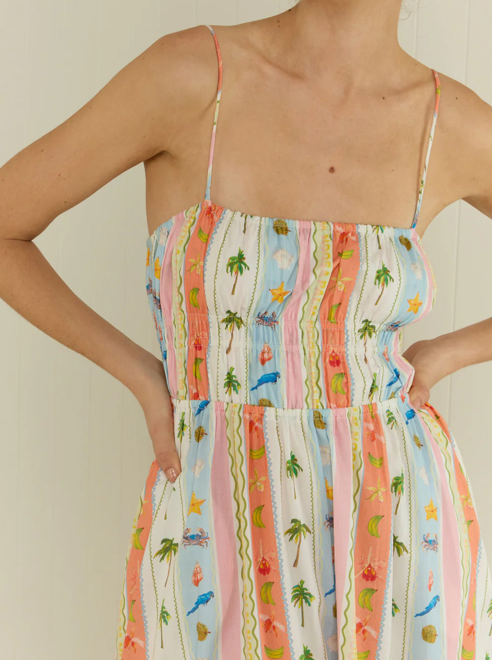 Destined to be a sunshine staple, the West Dress presents a fitted, elasticated waist, a floaty mid-length skirt and thin shoulder straps for easy wearing.