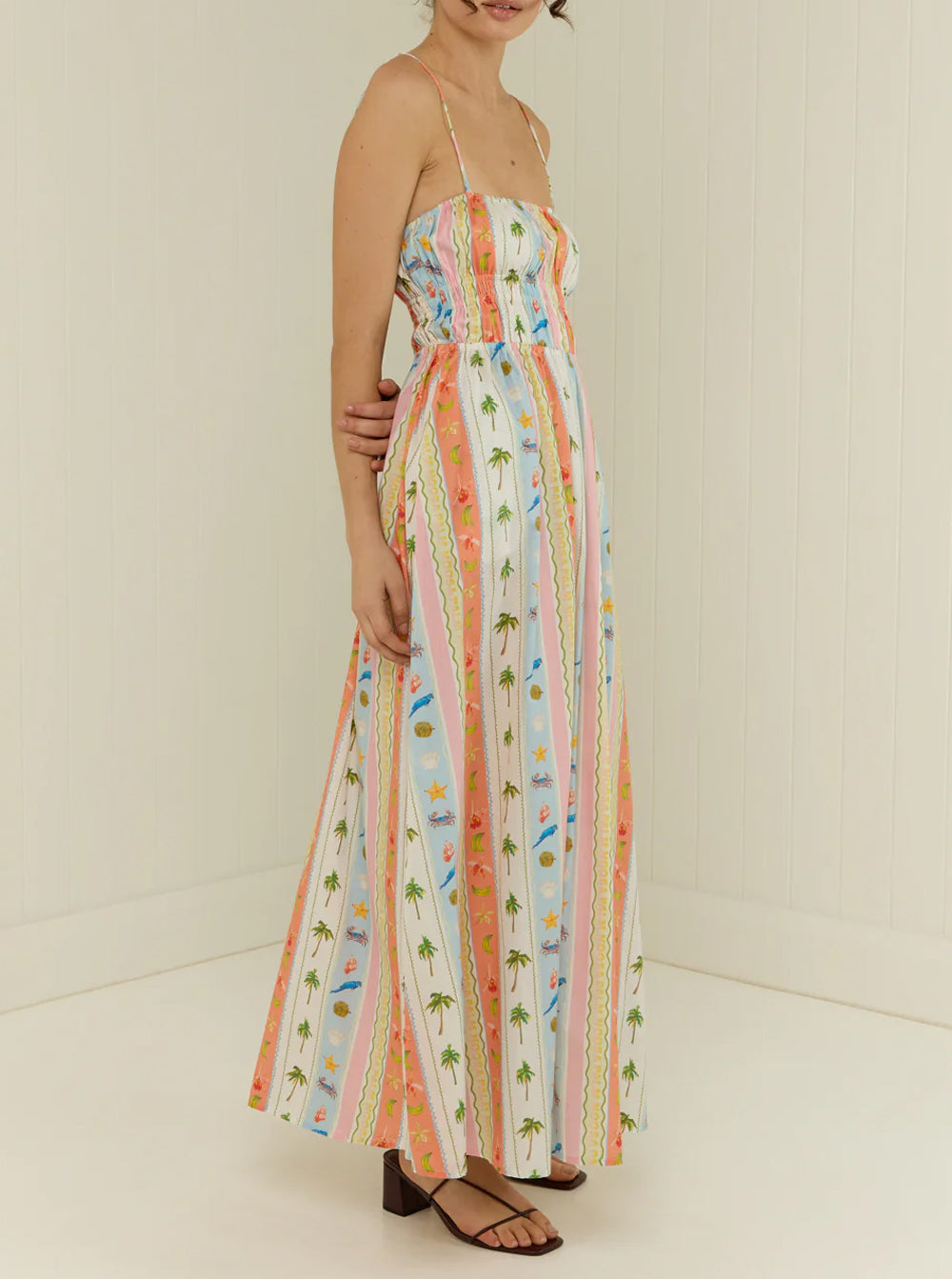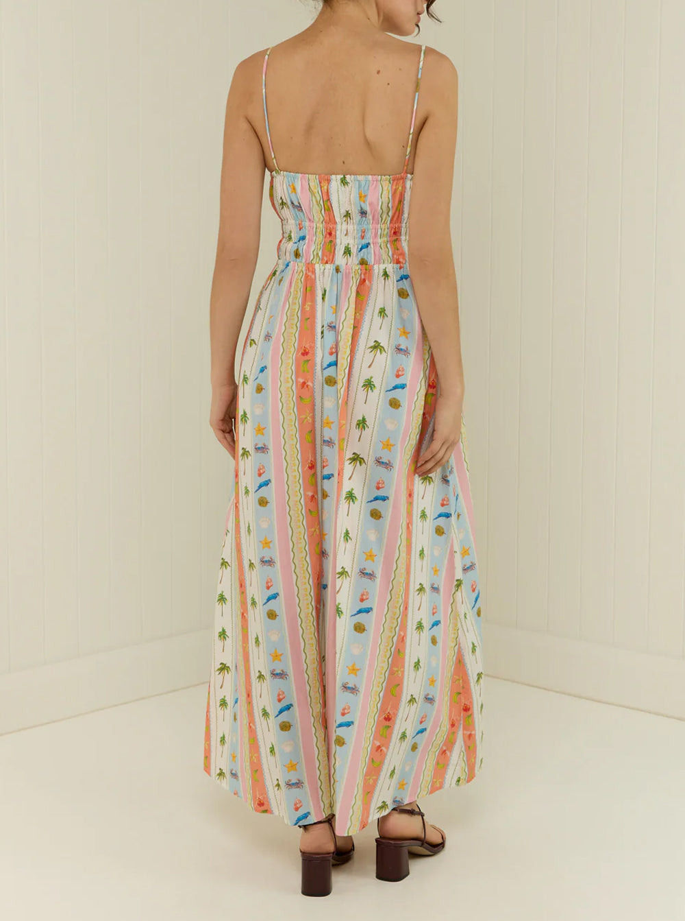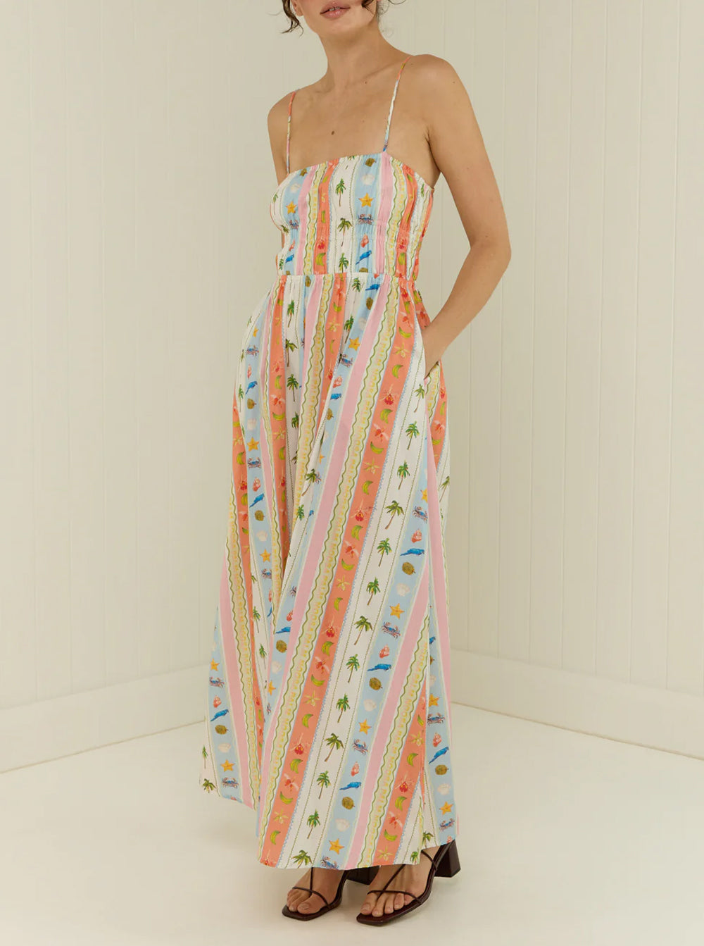 Destined to be a sunshine staple, the West Dress presents a fitted, elasticated waist, a floaty mid-length skirt and thin shoulder straps for easy wearing.