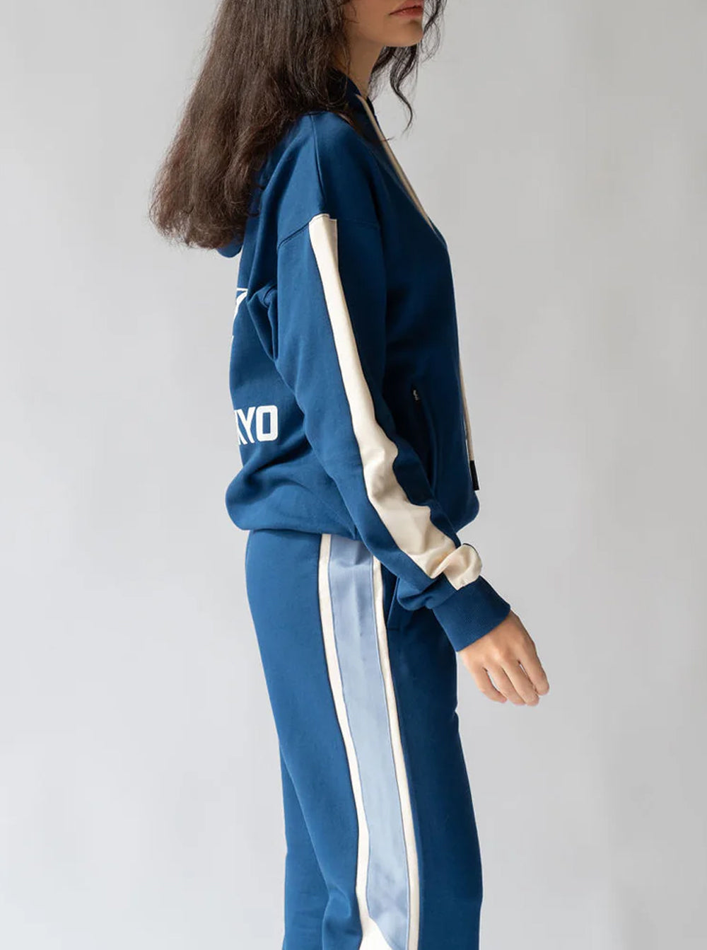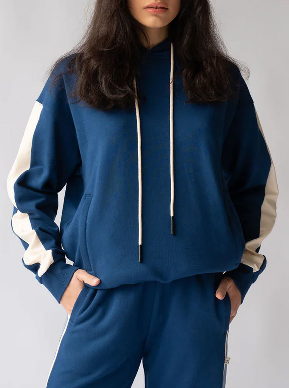 Cut in a beautiful cotton brushed fleece with a contrast trim featured down the sleeve in eggshell, rope drawcord and thoughtfully designed side welt pockets.