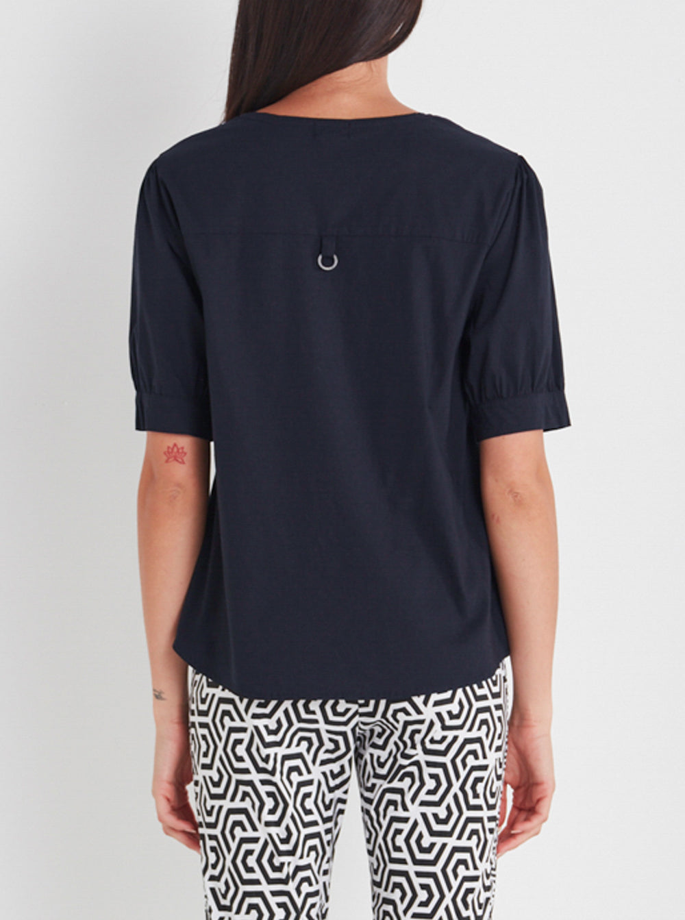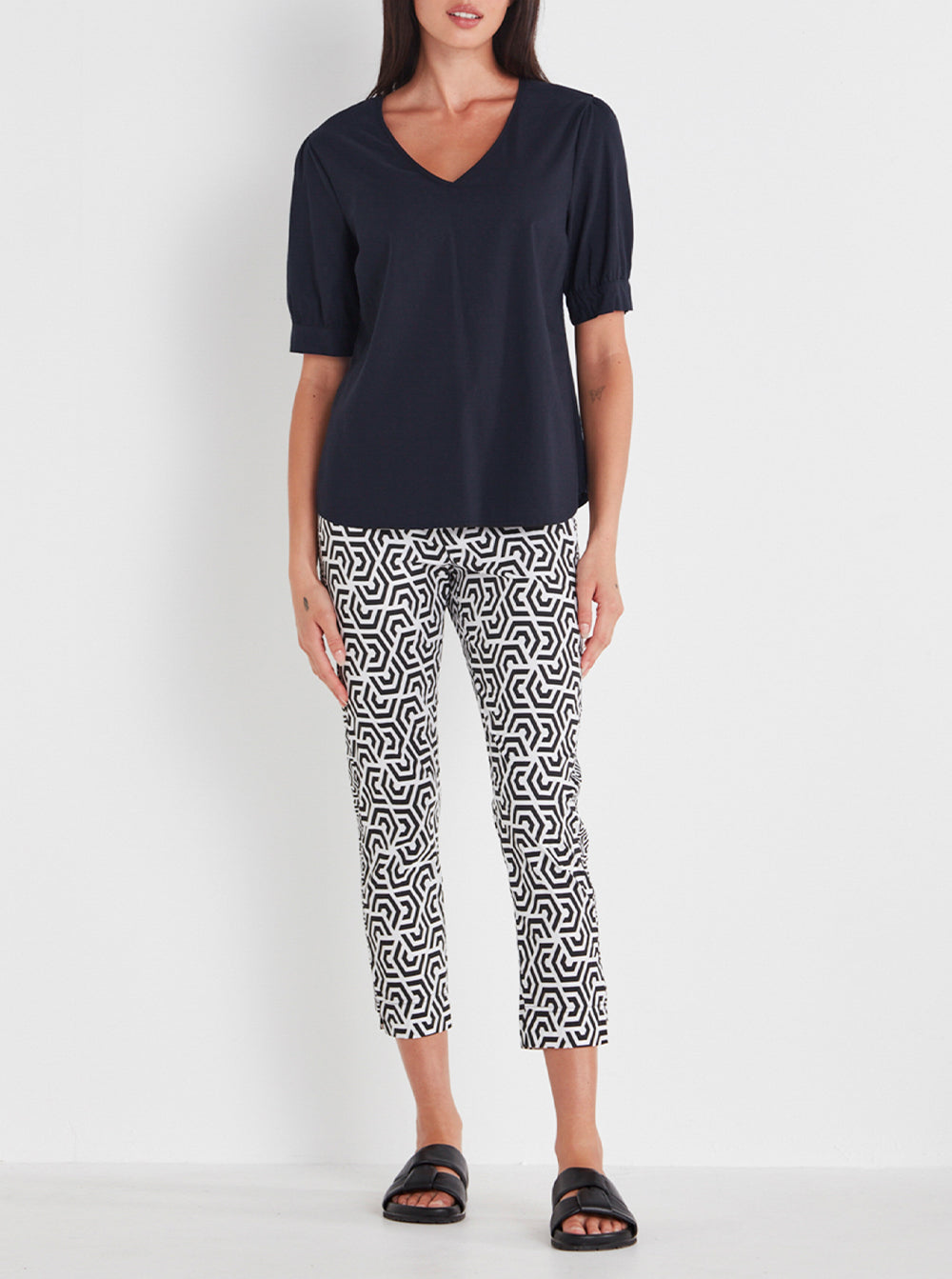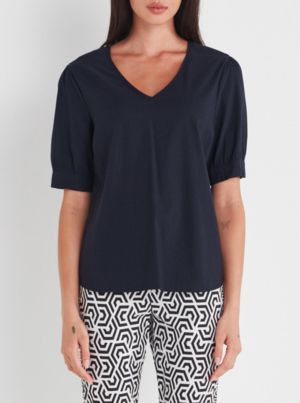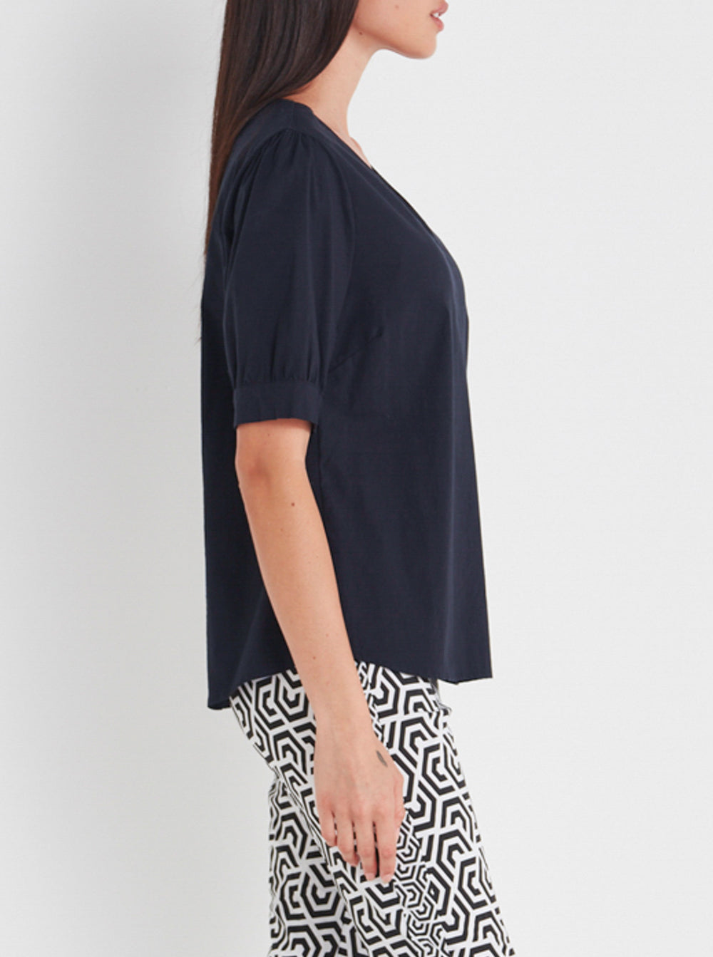 Acrobat V neckline top with set in puff sleeve.