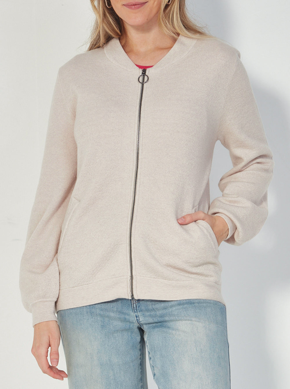 Crafted from 100% Merino wool, this bomber style jacket features a zip front and ribbed collar, cuffs, and hemline.