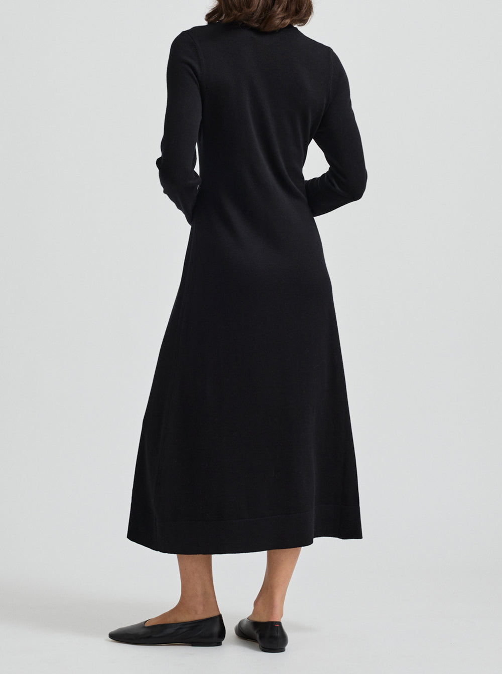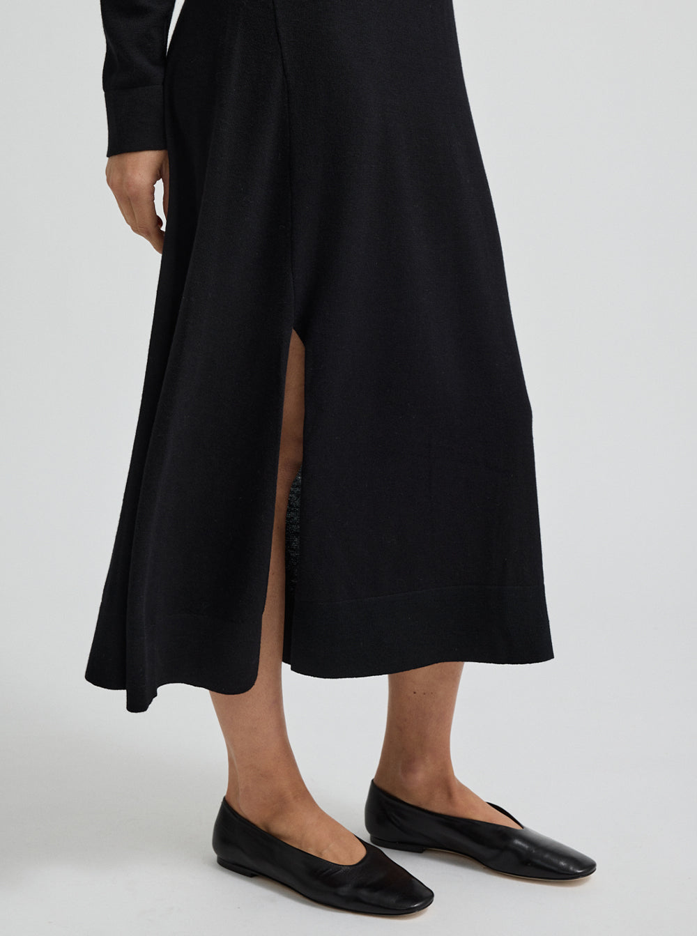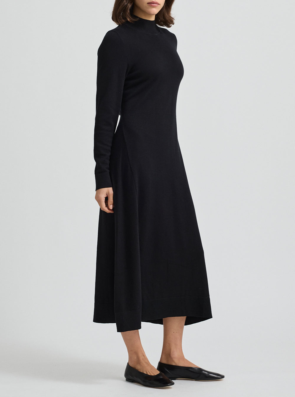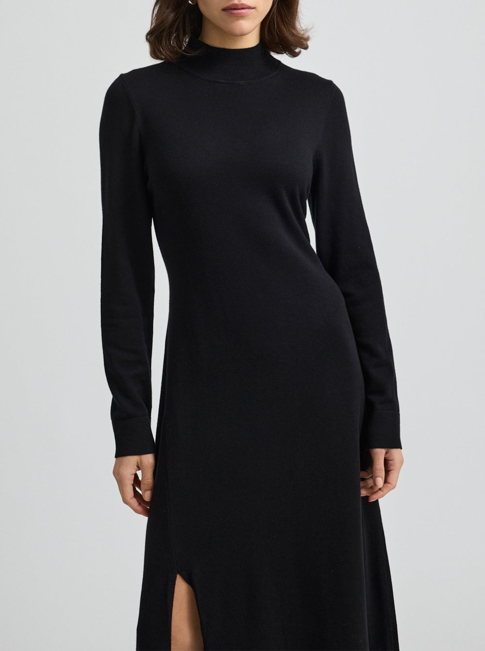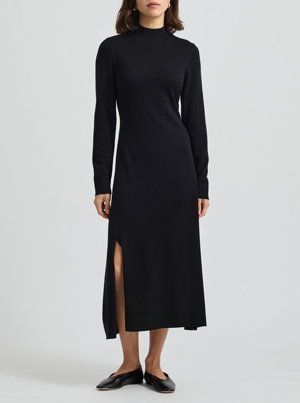 Toorallie's Fine Funnel Neck Dress features a sophisticated high neckline and angled side split. Crafted in superfine Australian merino wool, it finishes at the mid calf.
