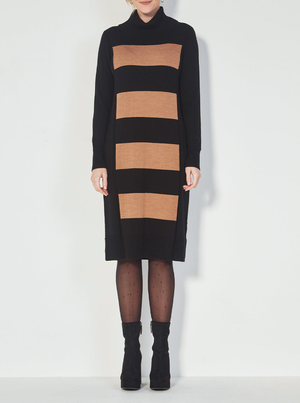 Featuring a classic roll neck and set in sleeves, this dress is accented with a contrast caramel stripe on the front panel.
