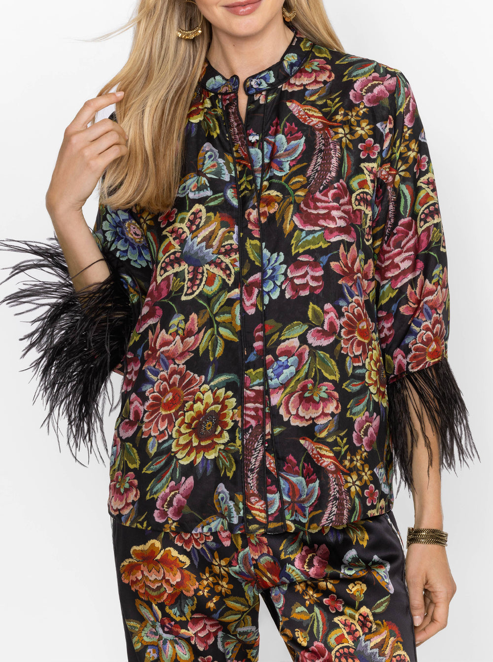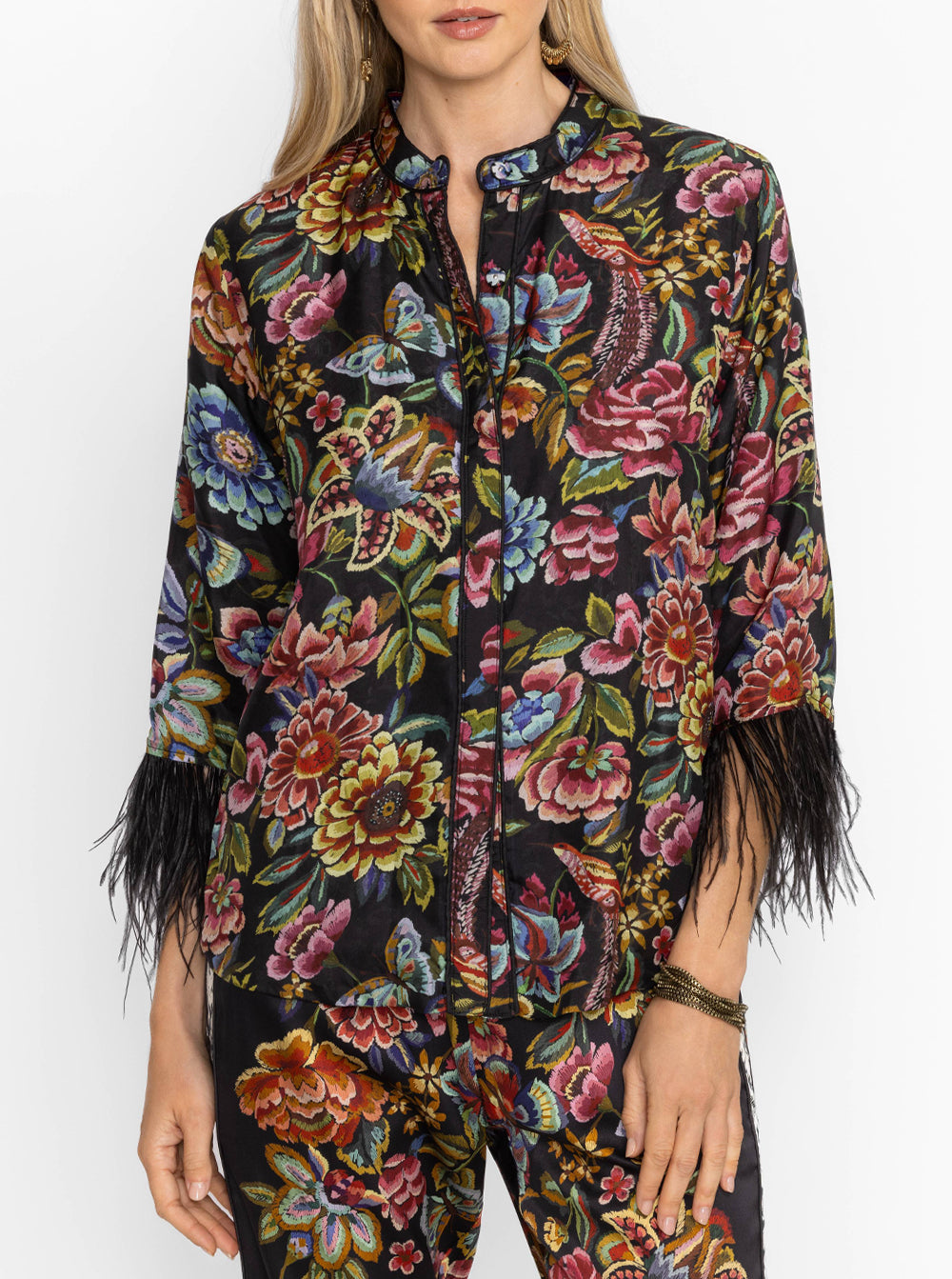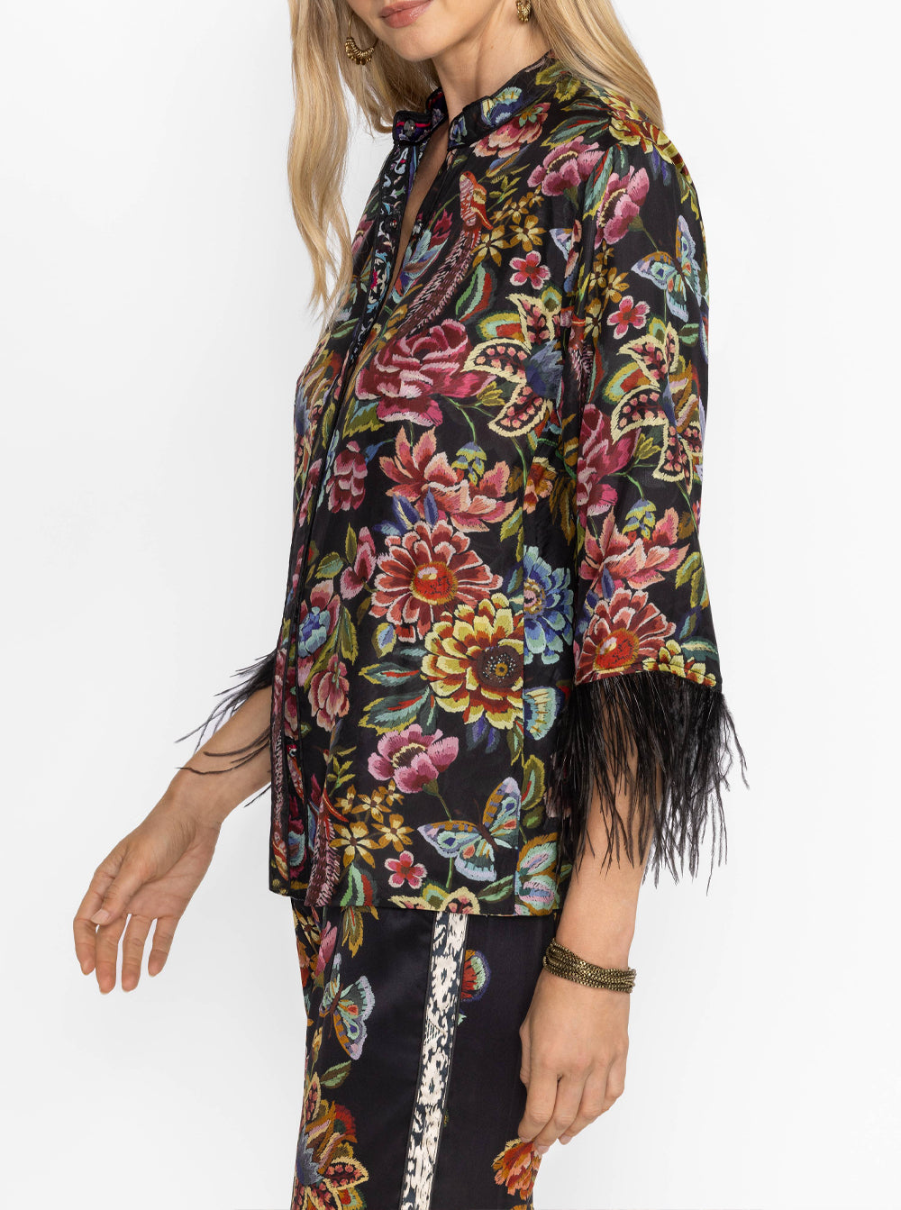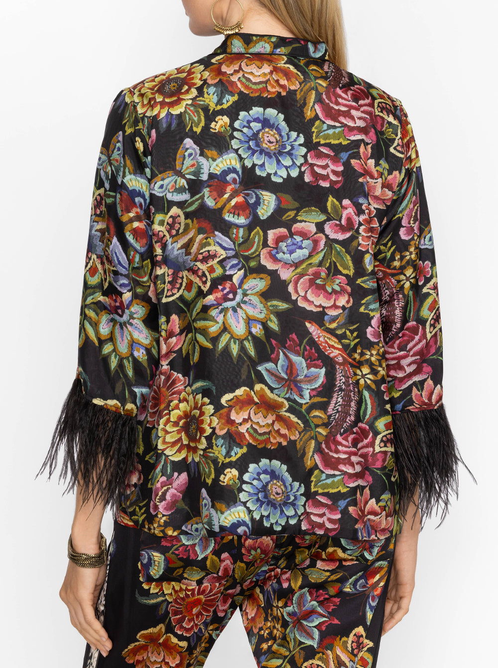Regular price $369.00Crafted from 100% sumptuous silk, the Lewella Feather Trim Kimono is adorned with an intricate floral pattern.