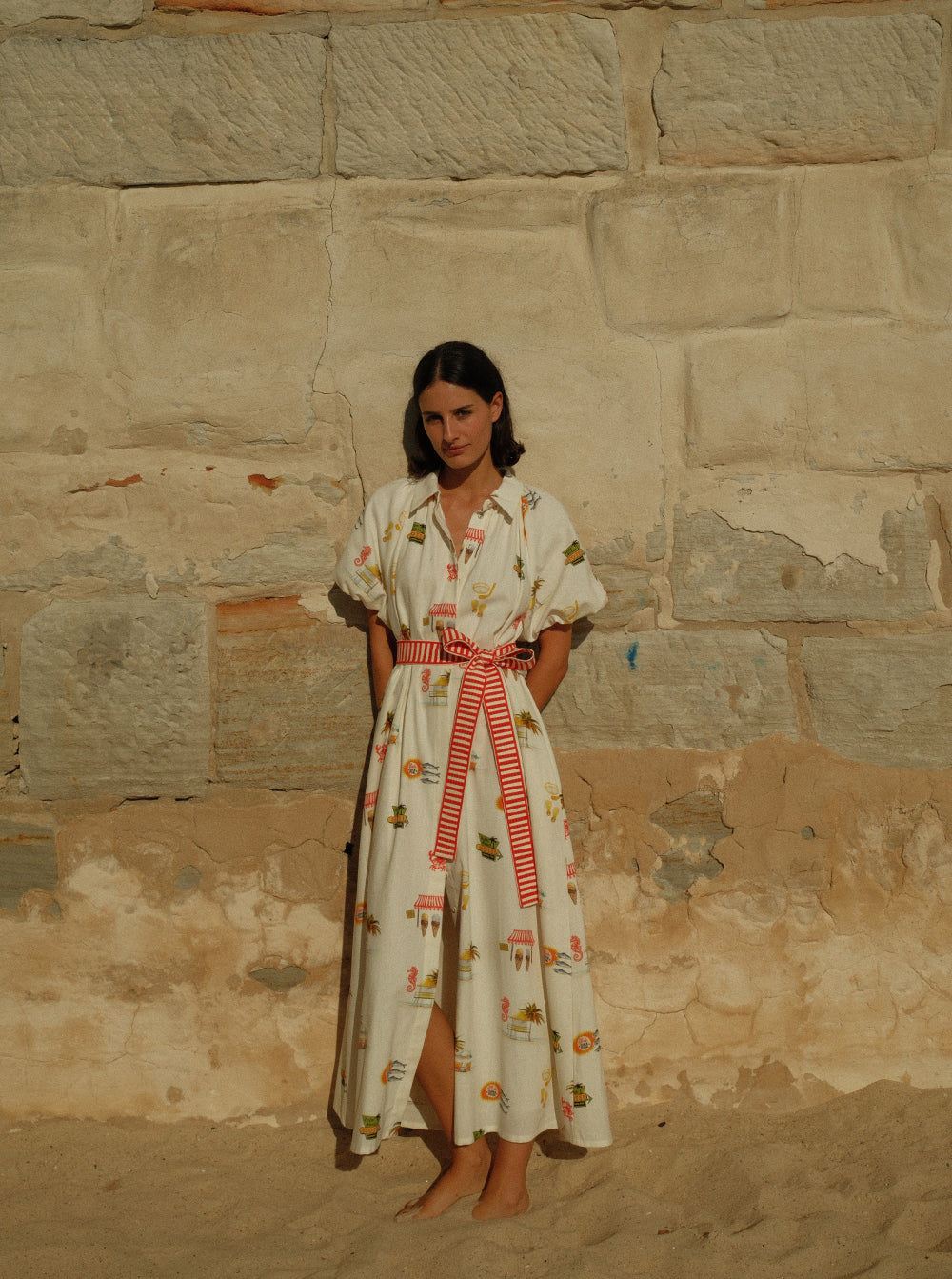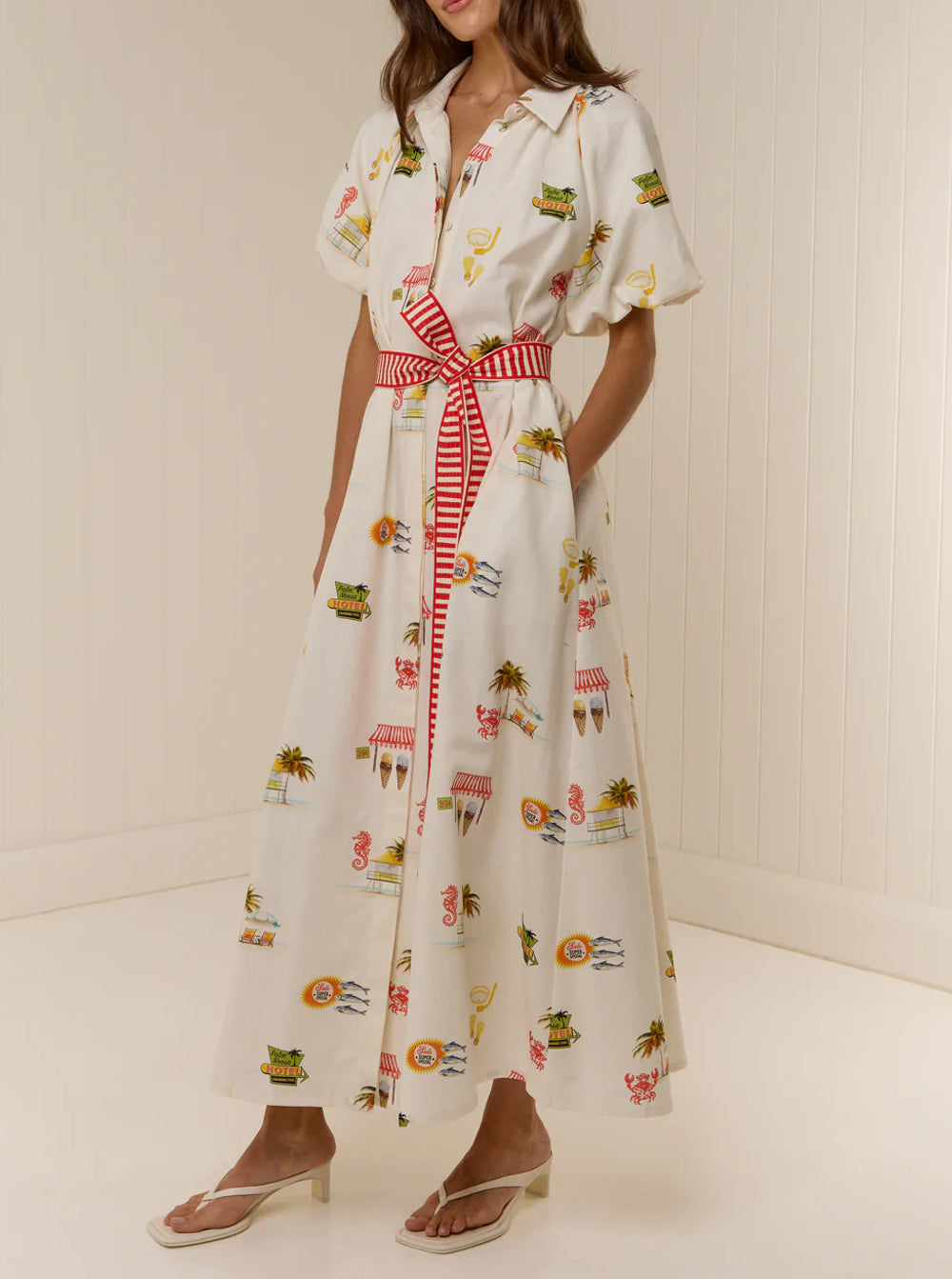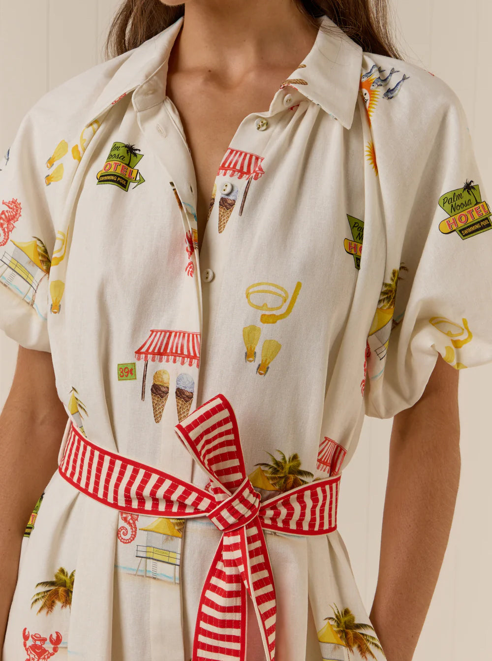 The Marla dress features a point collar, blouson short sleeves and centre front button detailing, finished with a removable contrast sash belt for a relaxed but elevated fit.