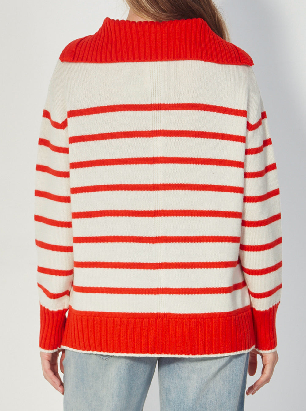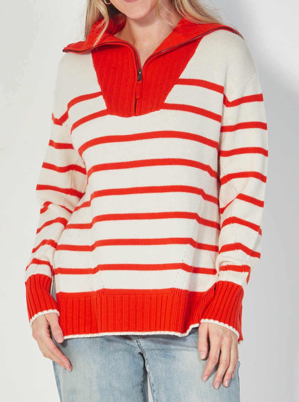 Made from 100% Merino, this chunky knit sweater boasts an extended rib collar that zips from the bustline. The pointelle knit detail on the front adds a touch of elegance, while the deep rib cuff and hemline offer a comfortable fit.