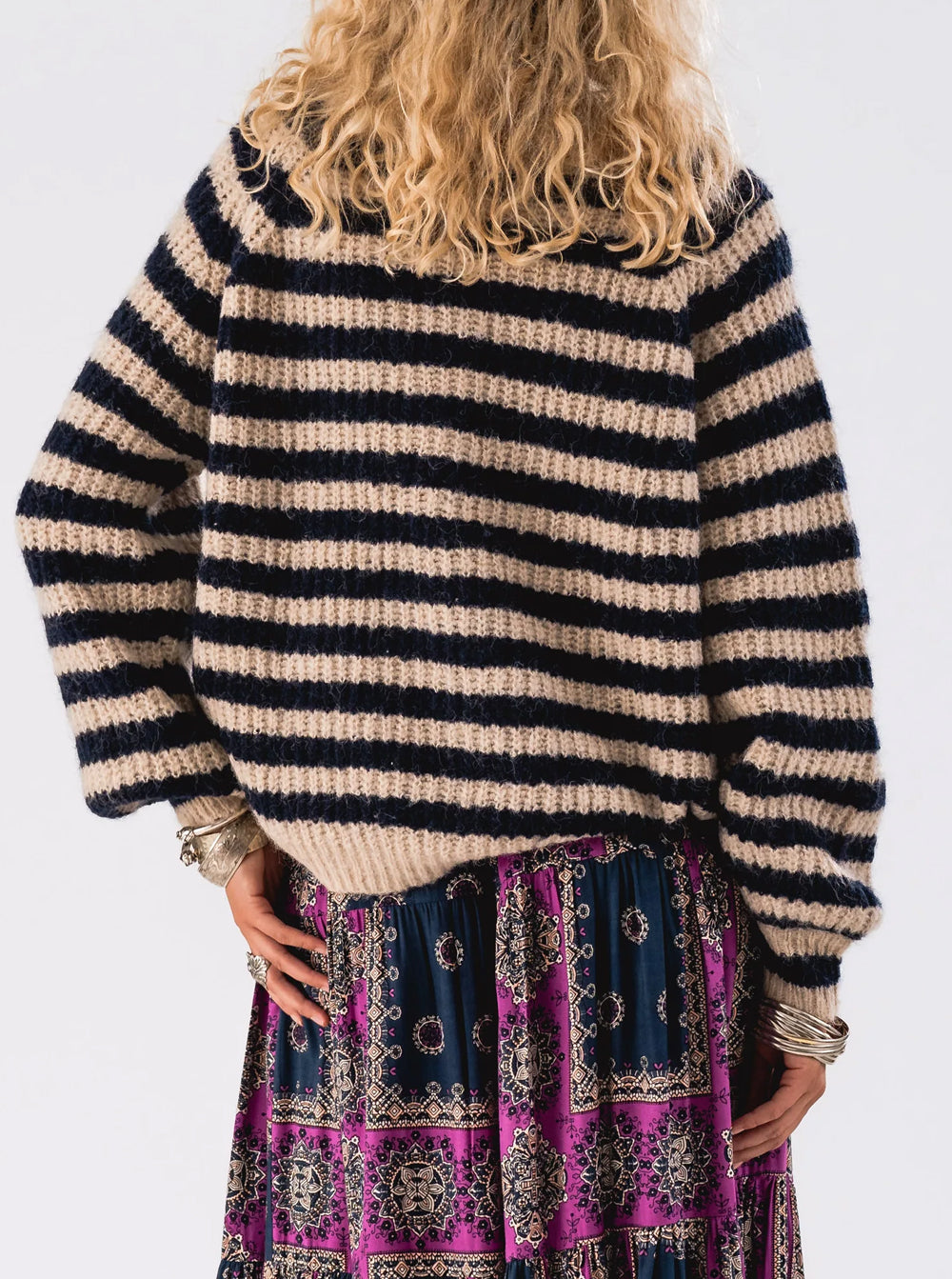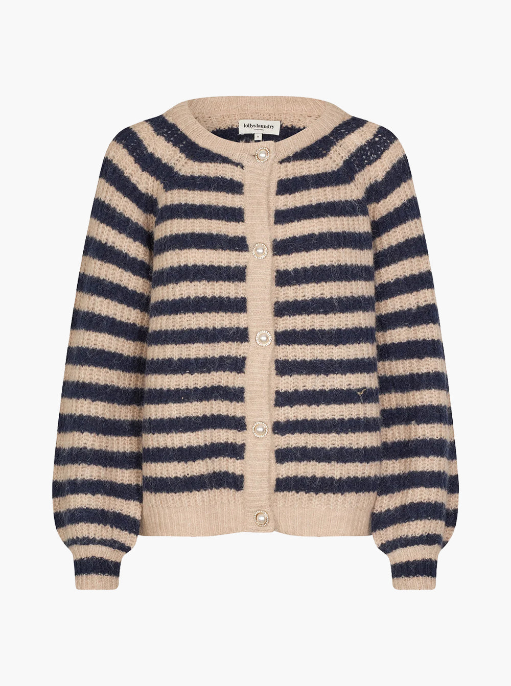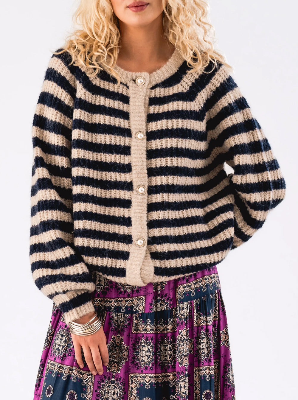 The cardigan features beautiful beige and light blue stripes, adding a fresh and relaxed look. It has a full button closure with elegant rhinestone buttons and ribbed edges on the sleeves, neck, and bottom hem, as well as along the placket.