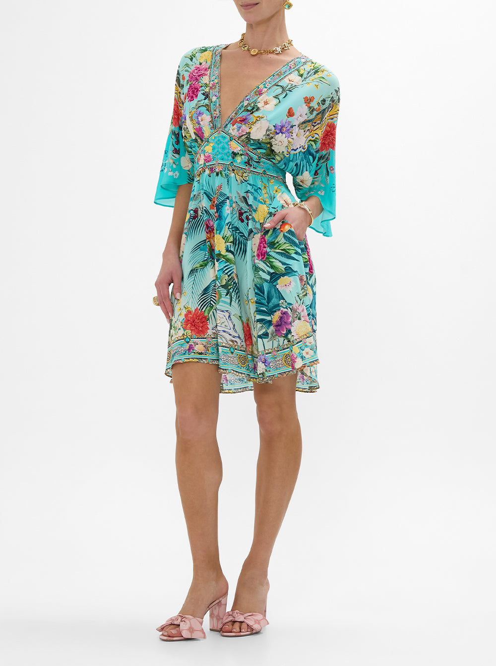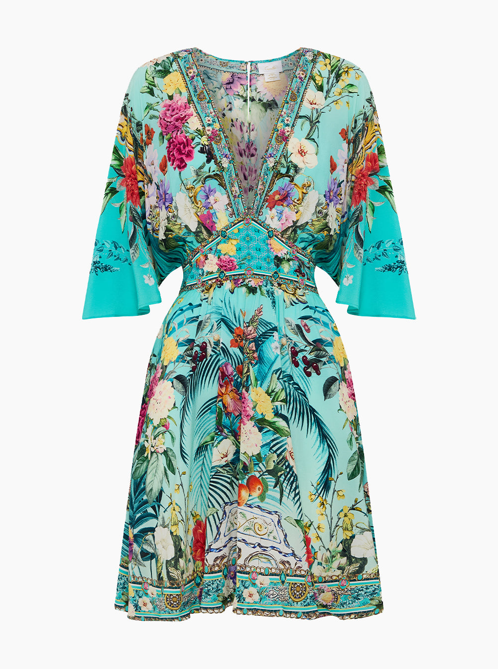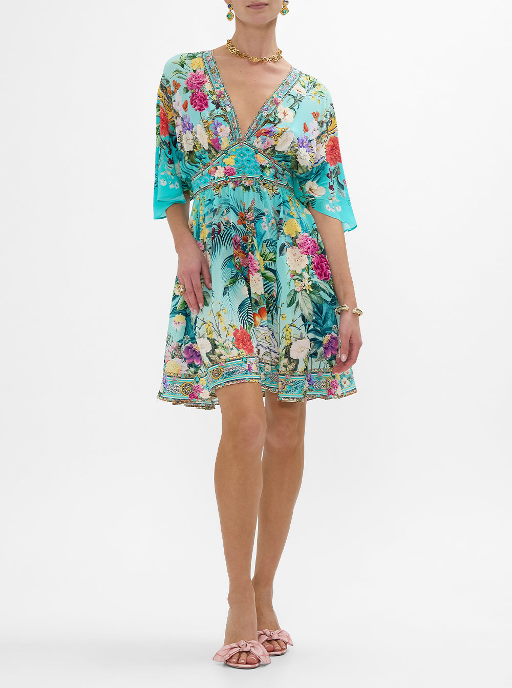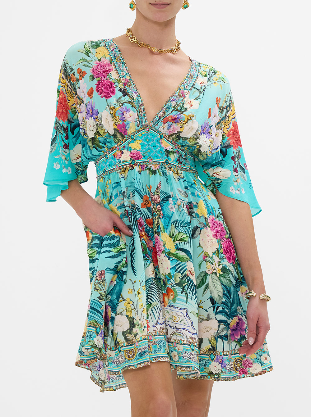 The skirt softly gathers and drapes into a flare at mid thigh and the batwing style ruffle sleeves create decadent drape at elbow length.