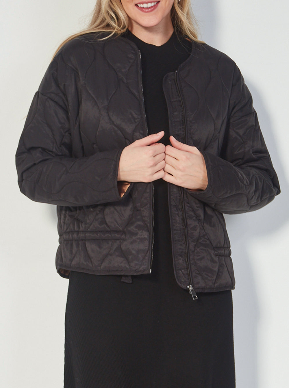 The round neckline and zip front provide a sleek look, while the angled side pockets offer practicality. The full-length sleeves and contrast bronze quilted lining add a touch of sophistication.