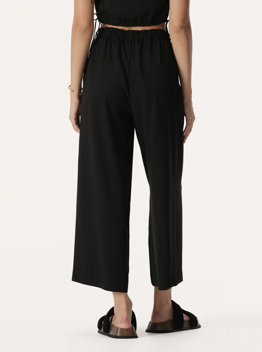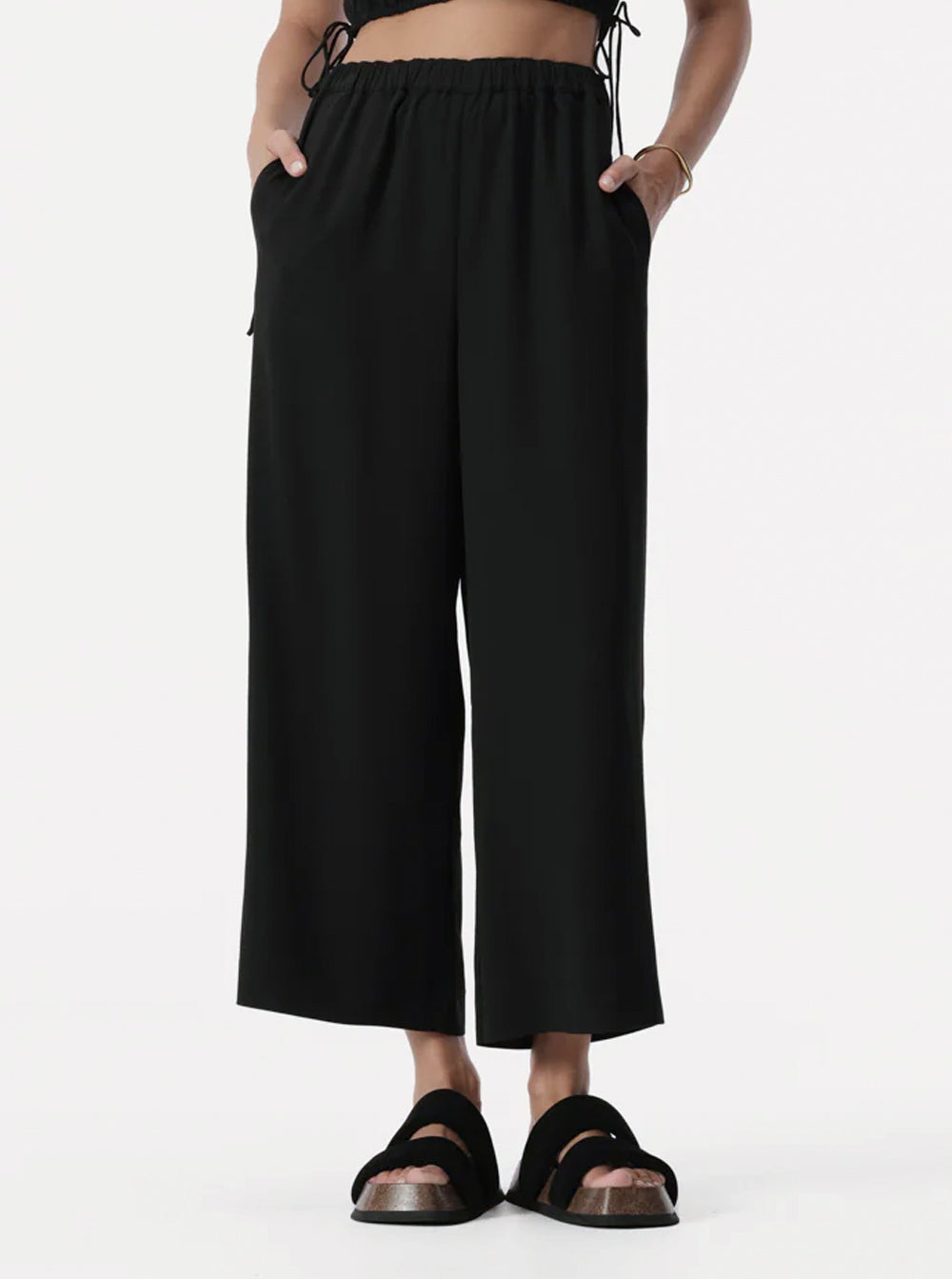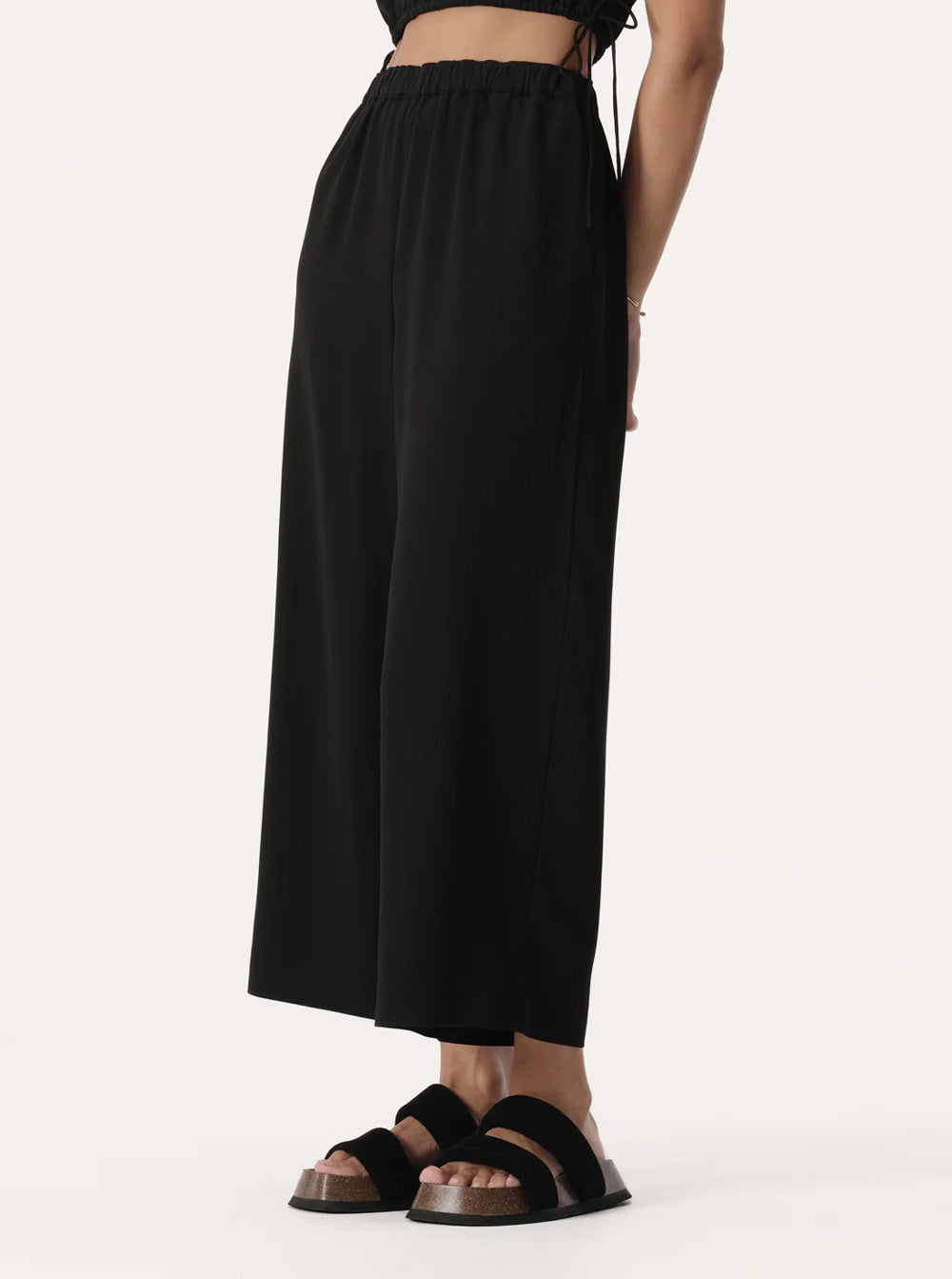 An easy-wear style for transitioning into the hotter seasons, these pants are made with a lightweight textured fabric. A cropped, wide leg style with a high, elasticated waistband and side pockets, these pants are fully lined.