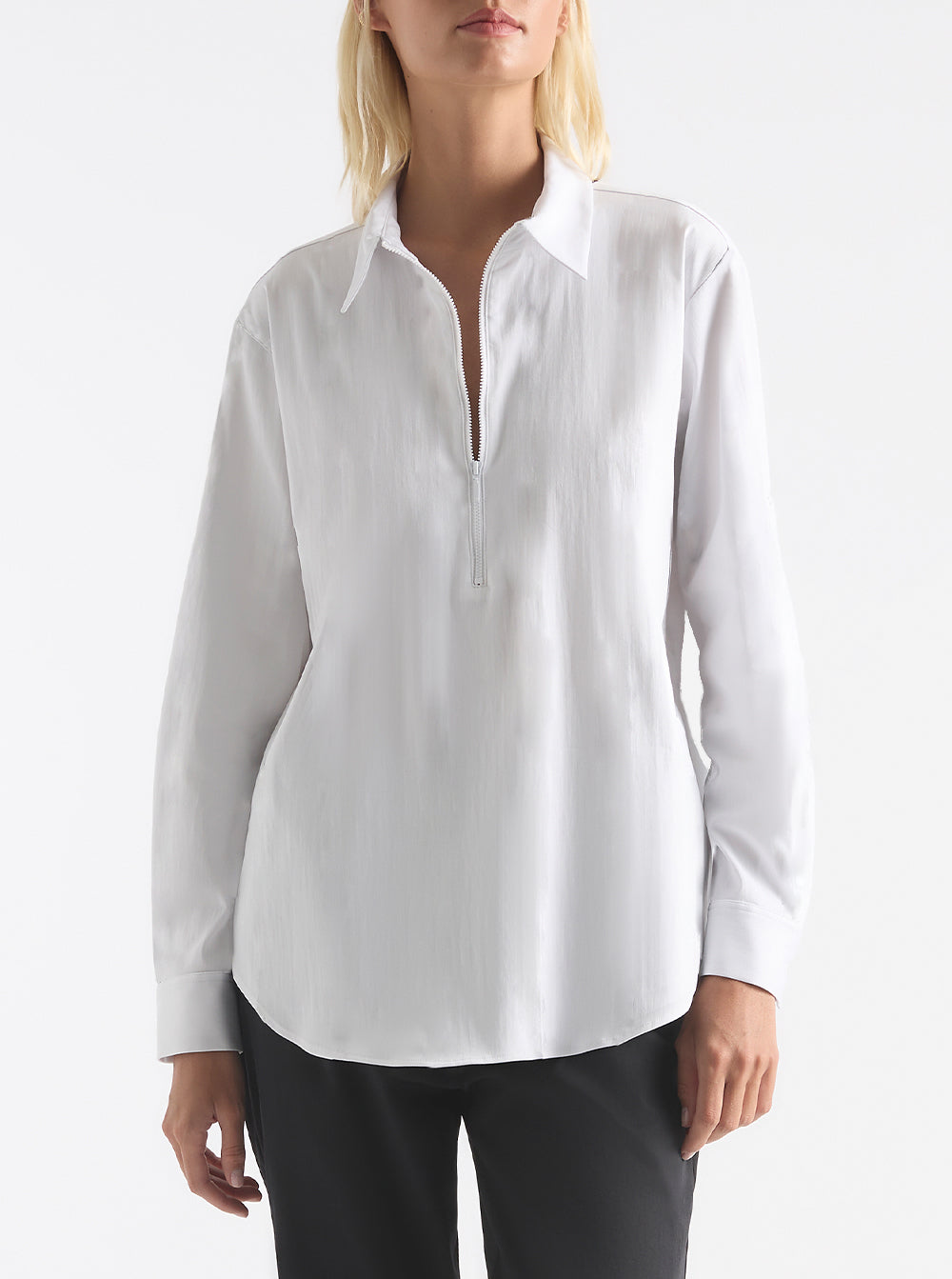 Cut from Microprene. A crisp, cotton rich, high stretch fabrication with a polished finish. The Zip Front Shirt offers a flattering fit with a contrasted zip and crisp collar.