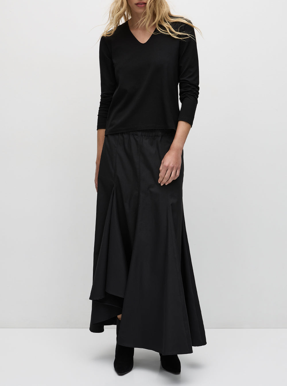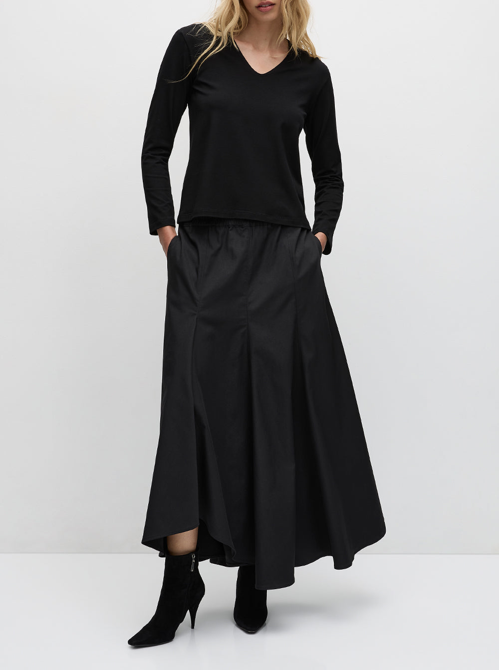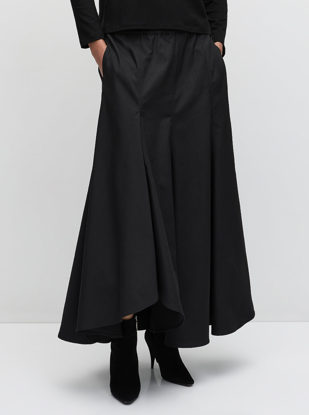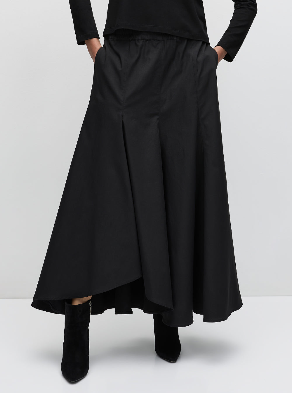 The Coil Skirt features all over vertical panels on an A-line silhouette with hem kick detail on one side.