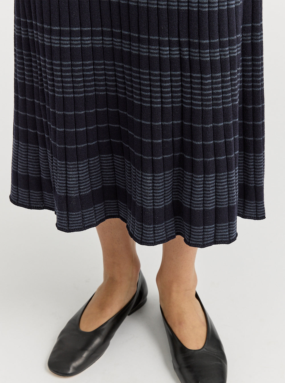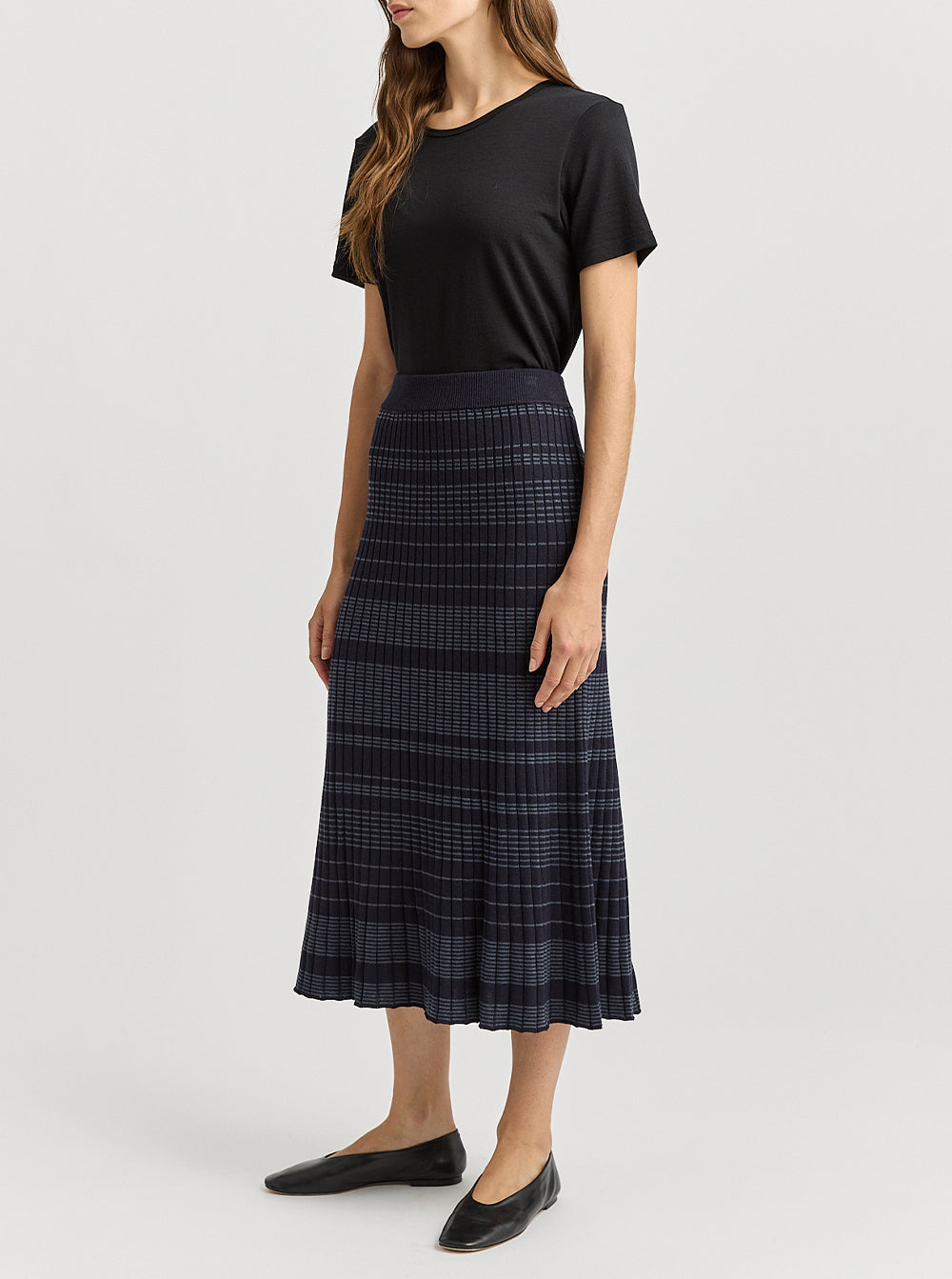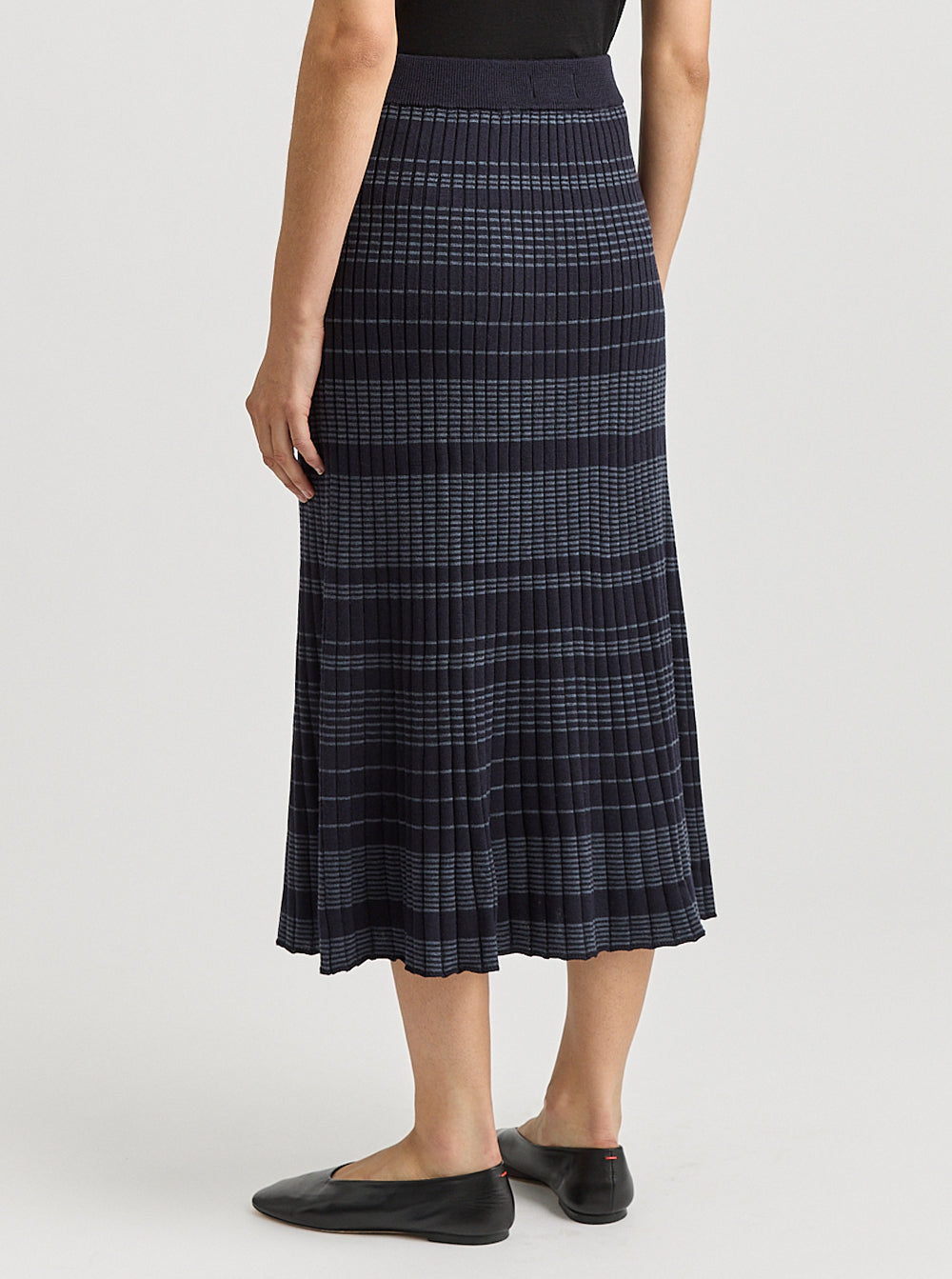 This classic midi skirt is knitted in a fine rib stitch, featuring a gently flared hem and a graduating stripe design.