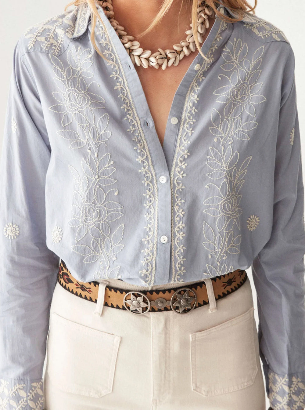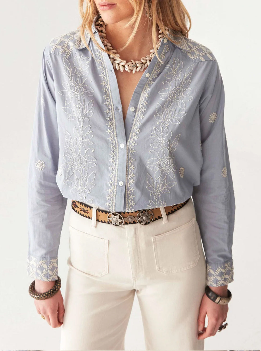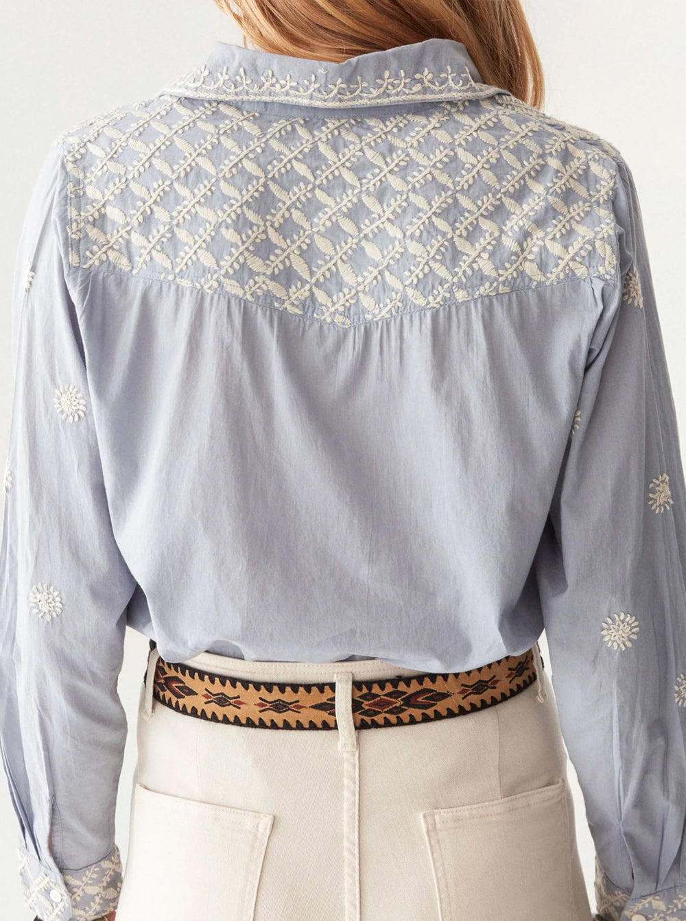 A muted shade of indigo, caught between dusk and stone, with intricate ivory hand-made 'chikan' embroidery tracing its surface like a quiet statement. The floral detailing isn’t ornamental—it’s structured, deliberate, and precise.