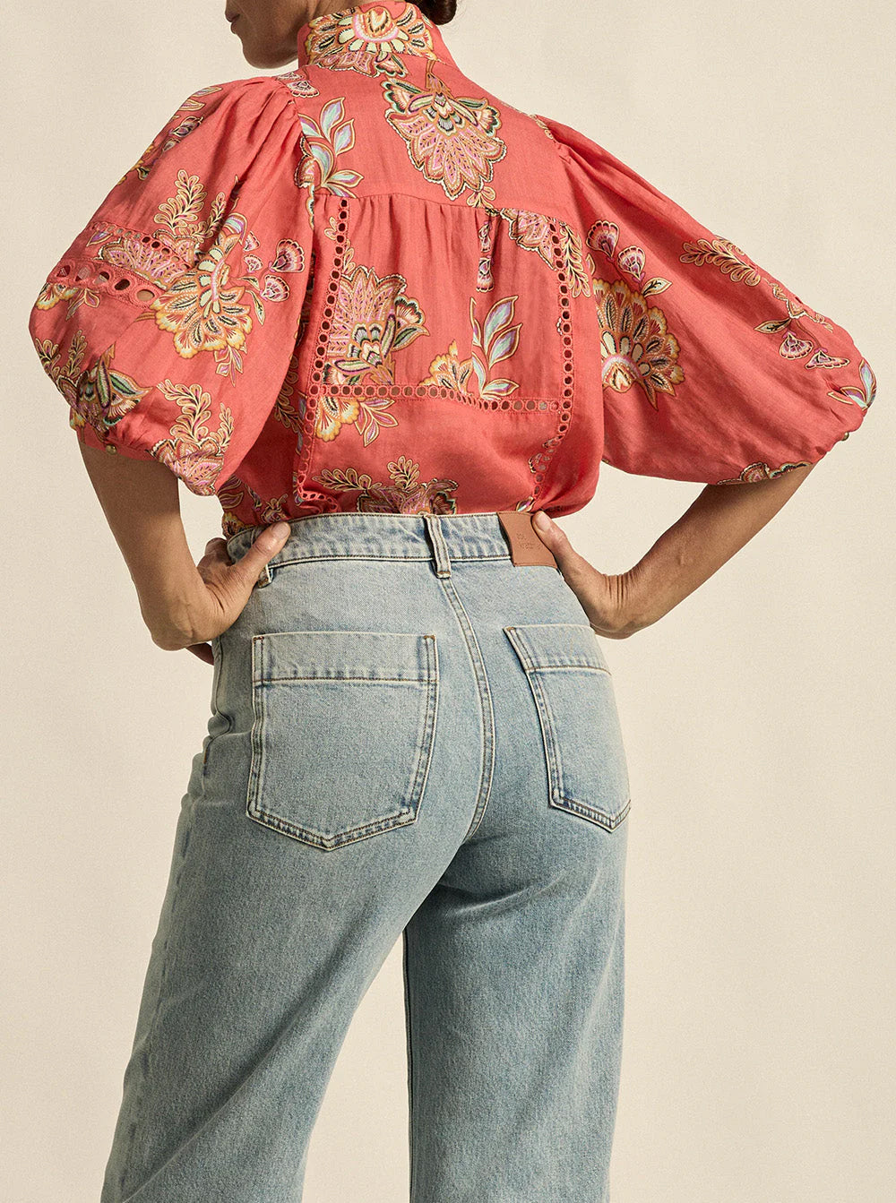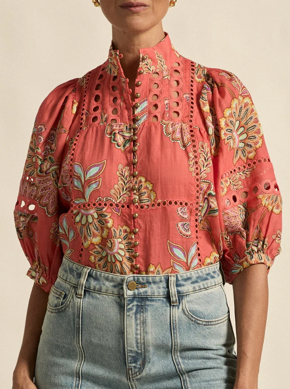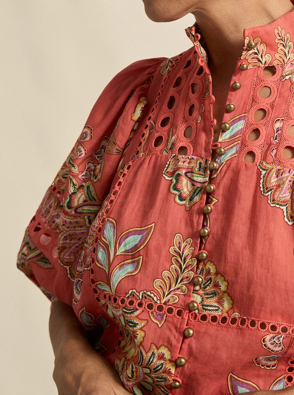 Ornate yet wearable, the Cabaret Top offers high-impact detail with ease. Circular lace trims and antique brass buttons deliver romantic appeal in a silhouette that works for every day.