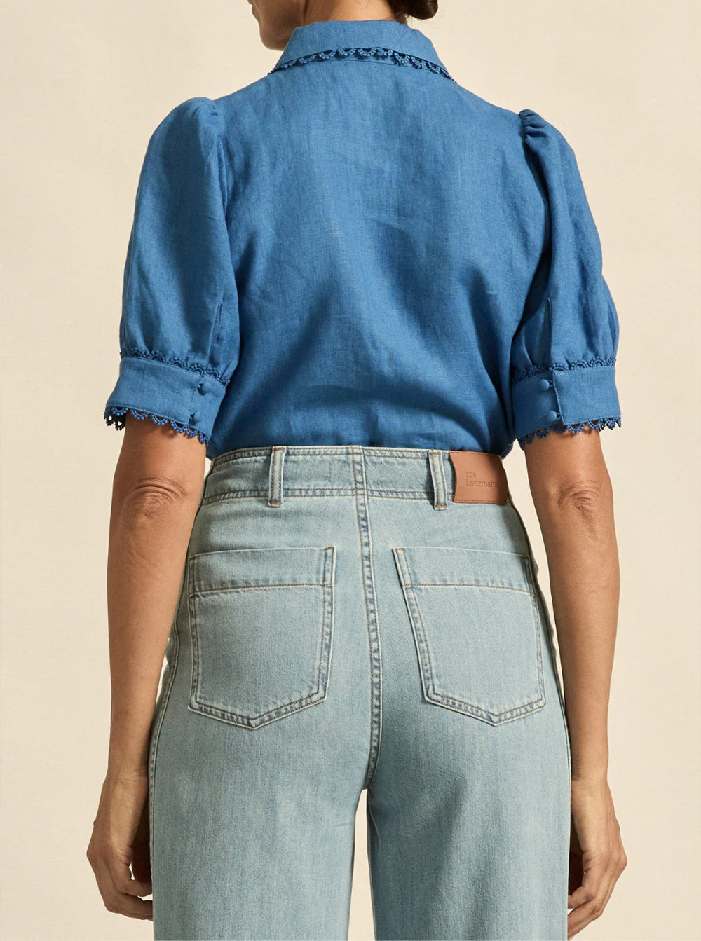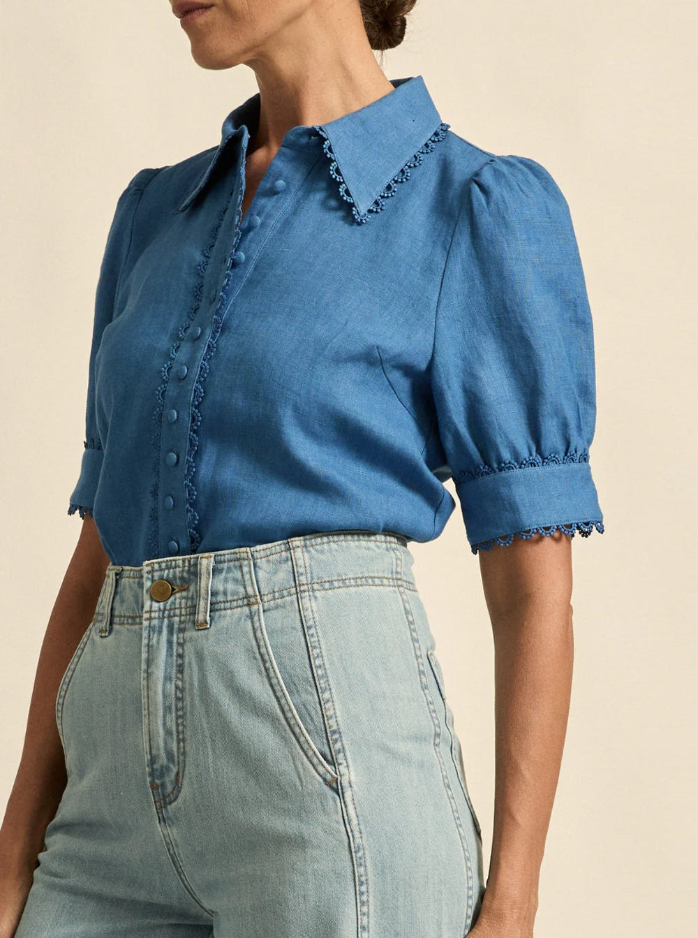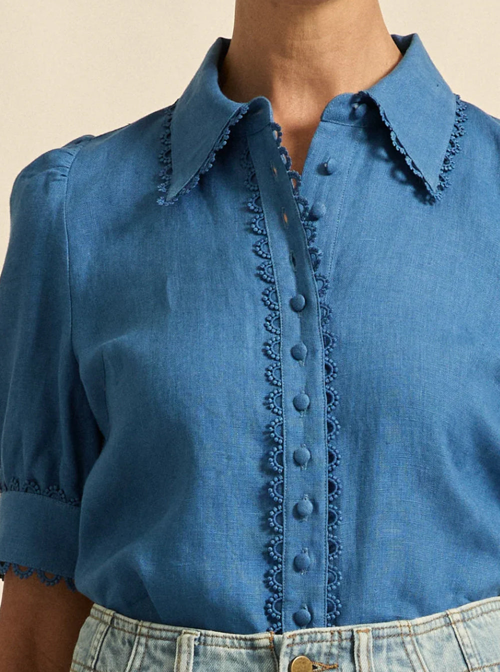 Polished with feminine nuance, the Tether Top is detailed with scalloped lace and classic tailoring. A classic inspired design, crafted in a vibrant, modern blue that captures the energy of summer.