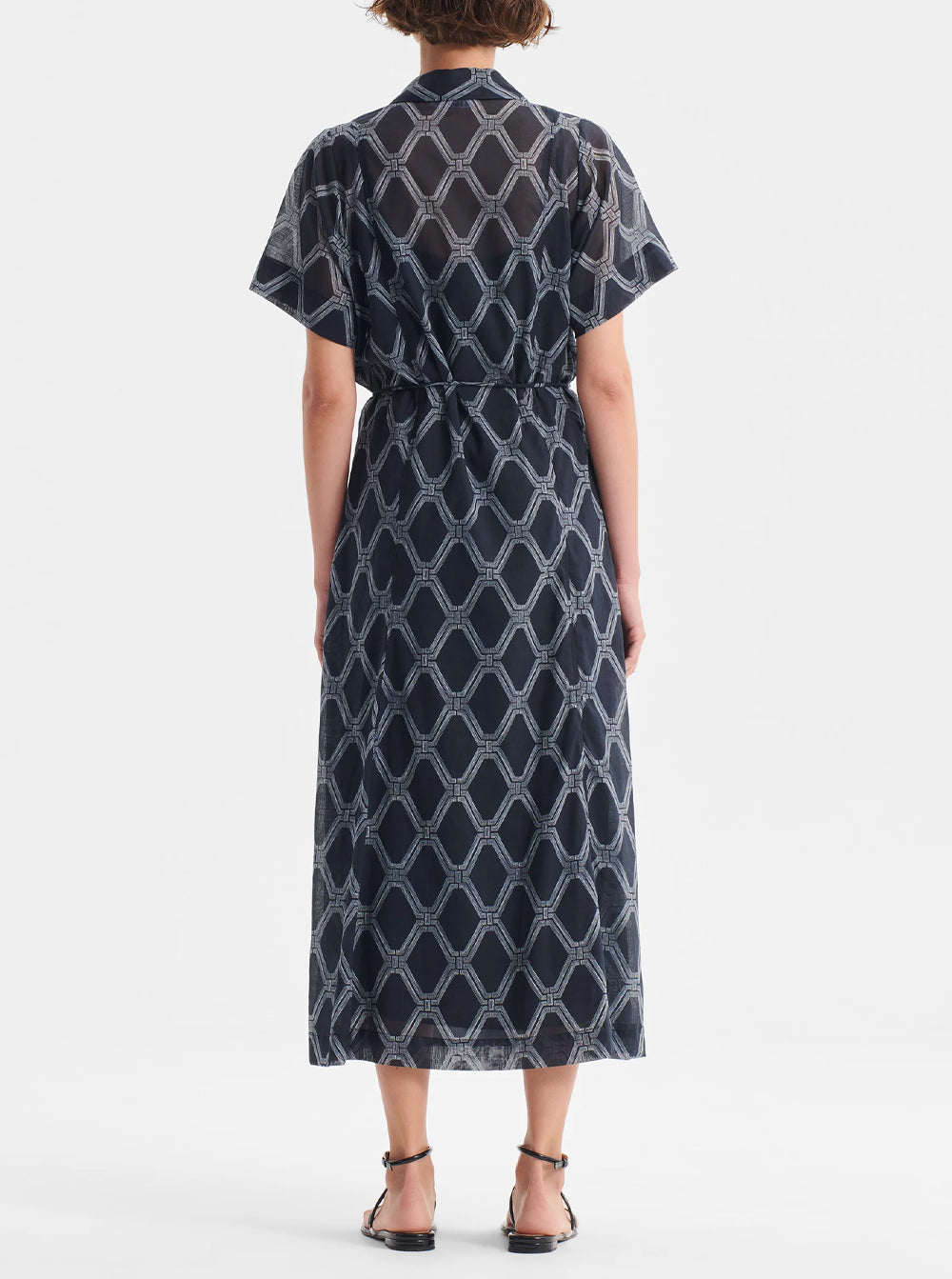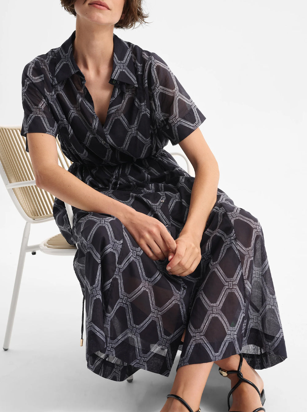 Featuring a traditional collar, short sleeves, and button-front placket, it is structured with panel detailing through the front and back. The midi-length silhouette offers effortless elegance for day or evening wear.
