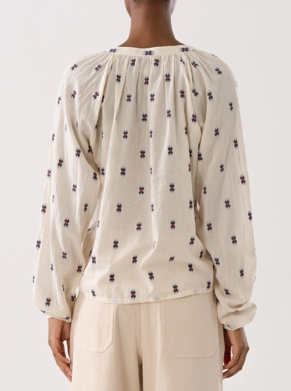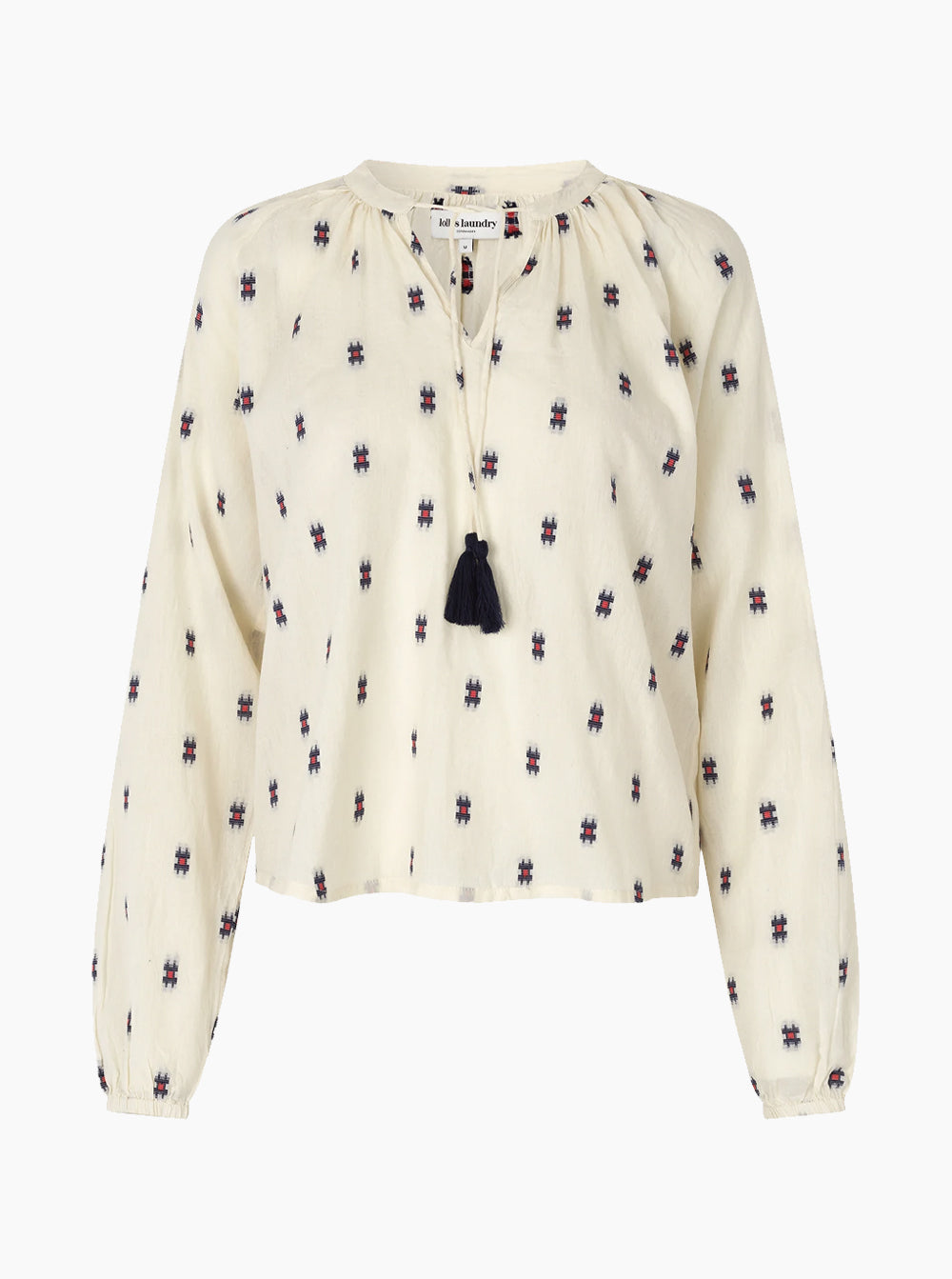 It has a lovely cream-colored base, highlighting the beautiful red/blue weavings in the material. Style it with the SunsetLL Maxi Skirt in the same material for a complete dress look. However you choose to style it, the BiharLL Blouse will be a favorite in the closet - with its soft material, beautiful details, and timeless design.
