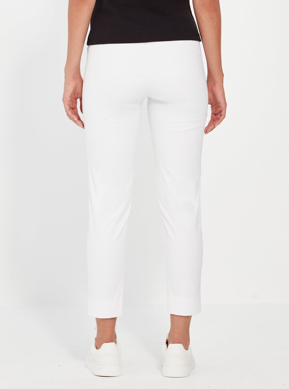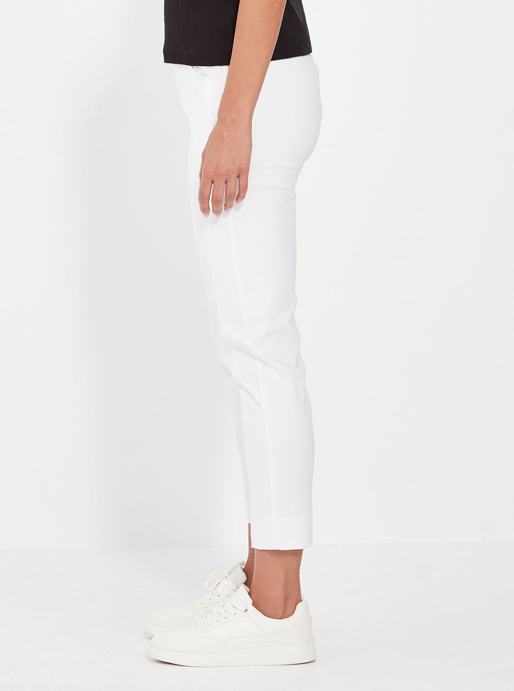Super stretch straight-leg pant with an elasticated waistband and faux pocket front detail.