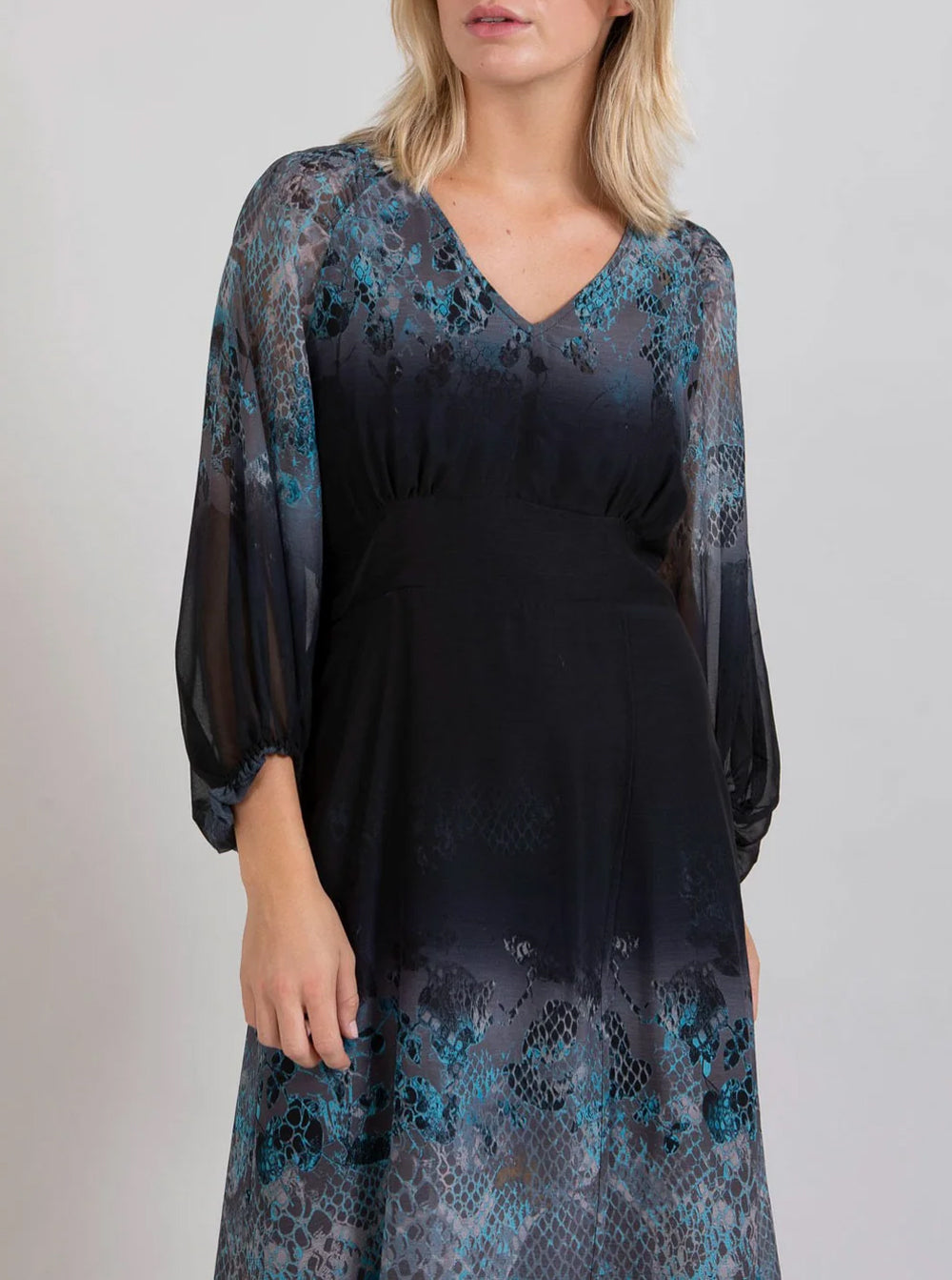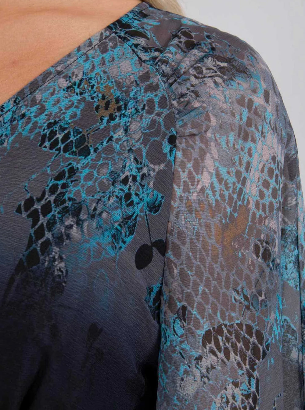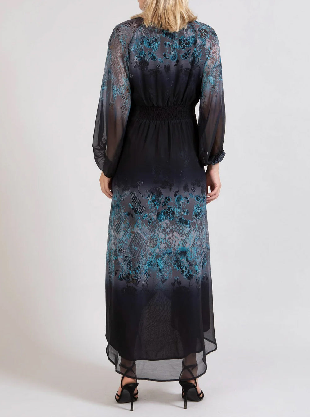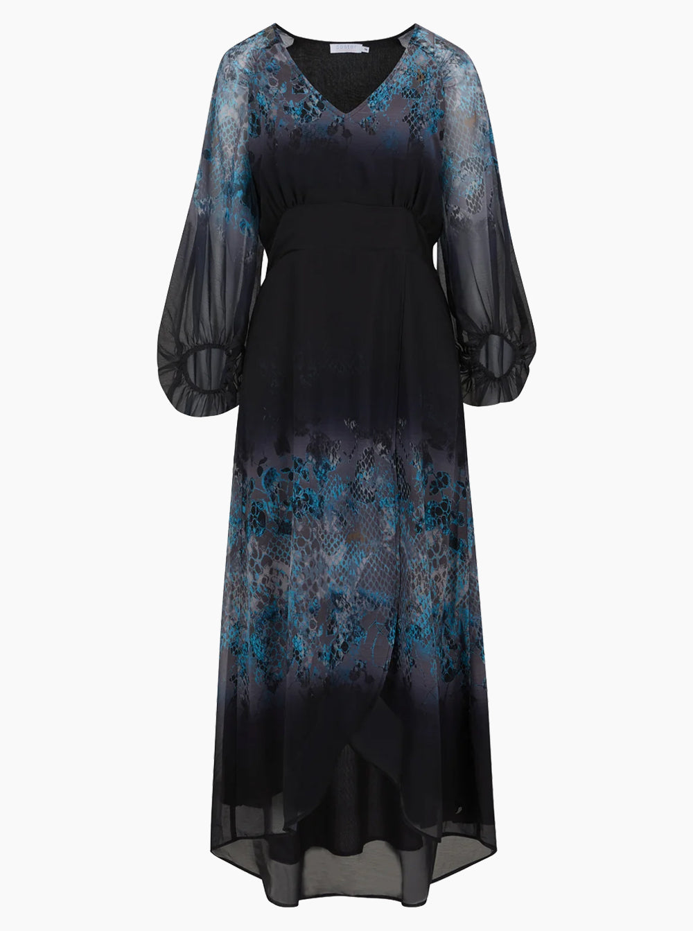 An elegant long dress in branches print. The wrap around looking detail creates a triangular cut at the bottom of the dress in the front. Through the sleeves you can see the silhouettes of the arms, which gives the dress a flowy look.