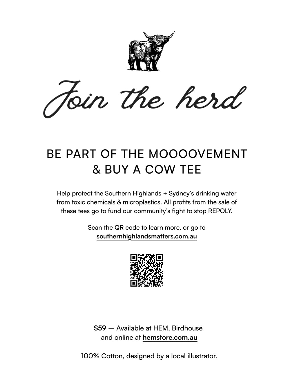 Our brand-new Highlander Tees aren’t just a wardrobe staple...they’re a statement. Every tee sold helps protect the Southern Highlands + Sydney’s drinking water from toxic chemicals and microplastics. 100% of profits go straight into our community’s fight to stop REPOLY.