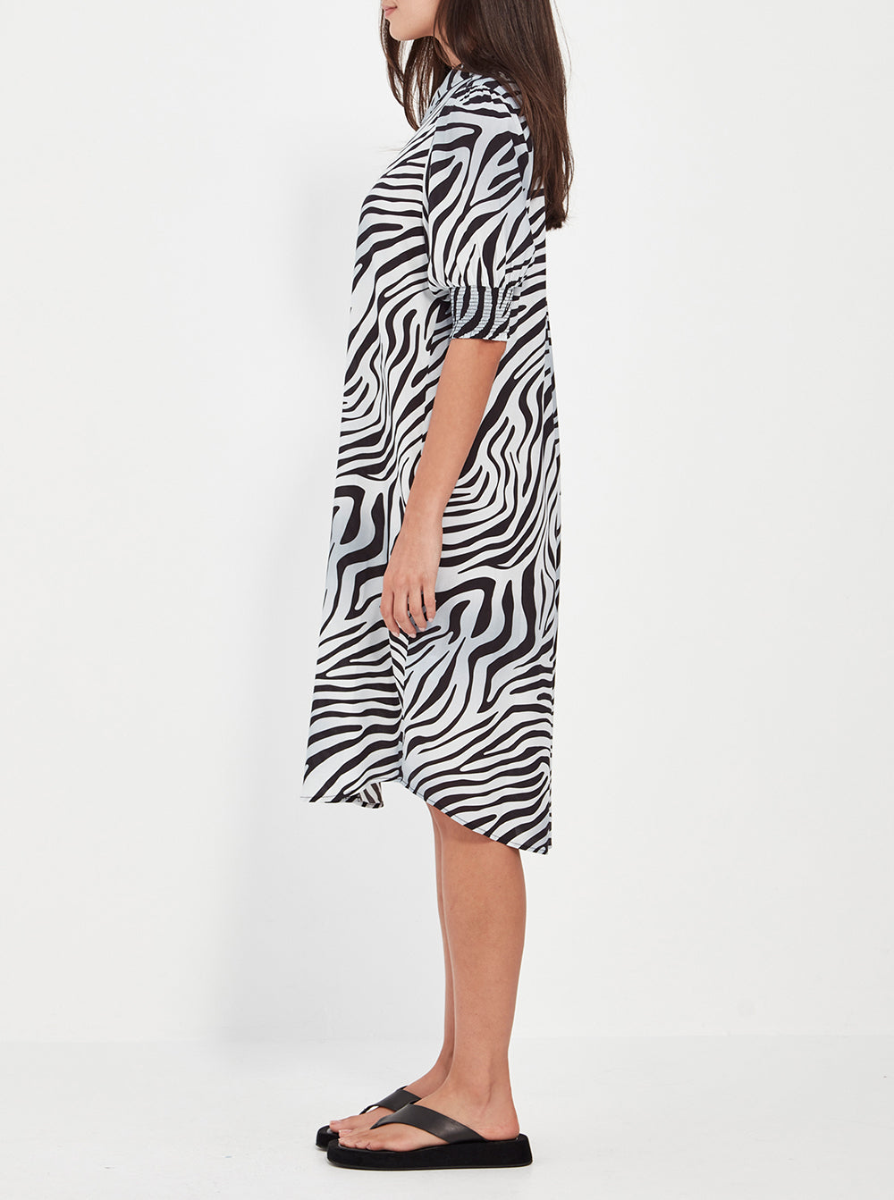 A classic shirt collar and button-through front offer everyday ease, while shirred cuffs add soft structure to the elbow-length sleeves.