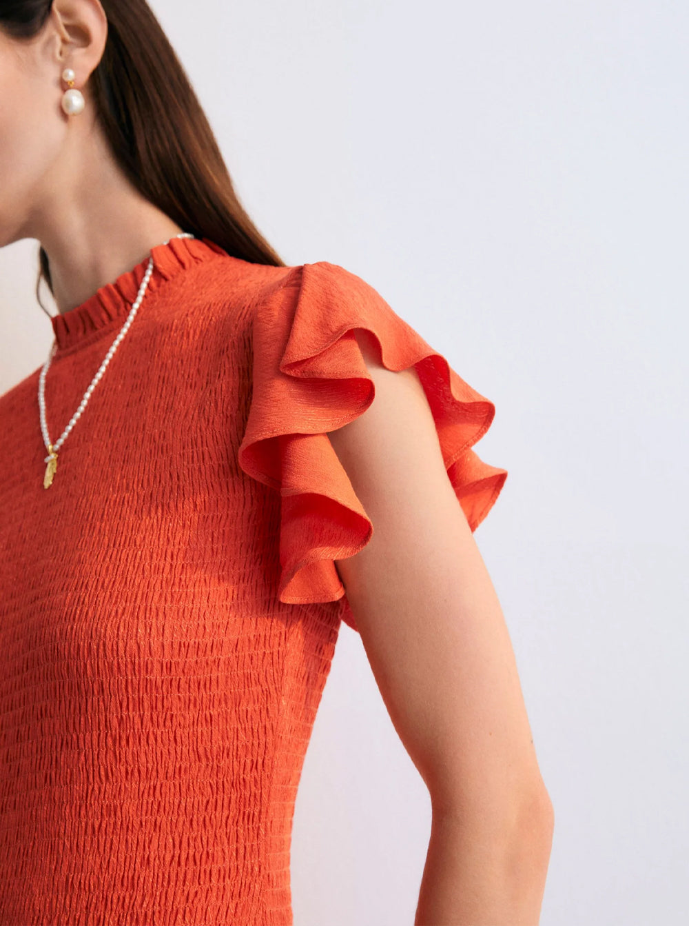 Designed with a smocked bodice for a flattering silhouette and adorned with delicate ruffles on the shoulders, this dress radiates charm and sophistication.