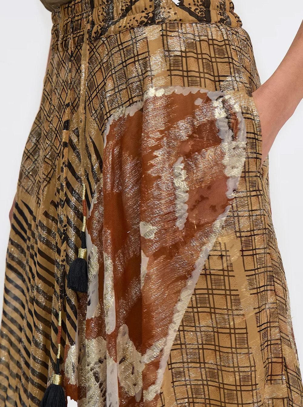 Made from a lamé viscose fabric and shimmering gold thread, this skirt catches the eye with its “carpe coy” print judiciously placed on the model.