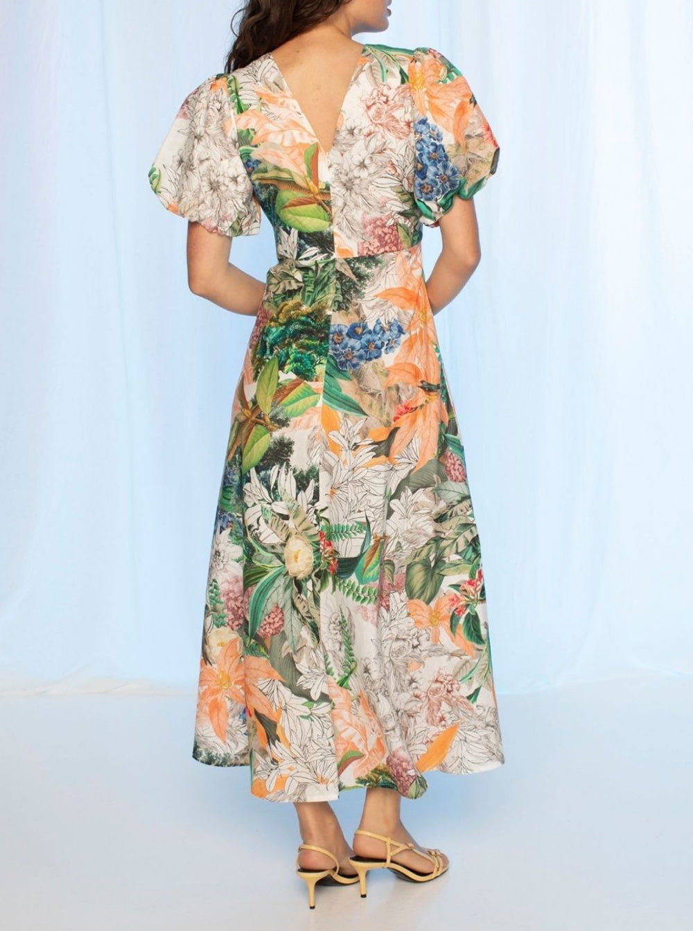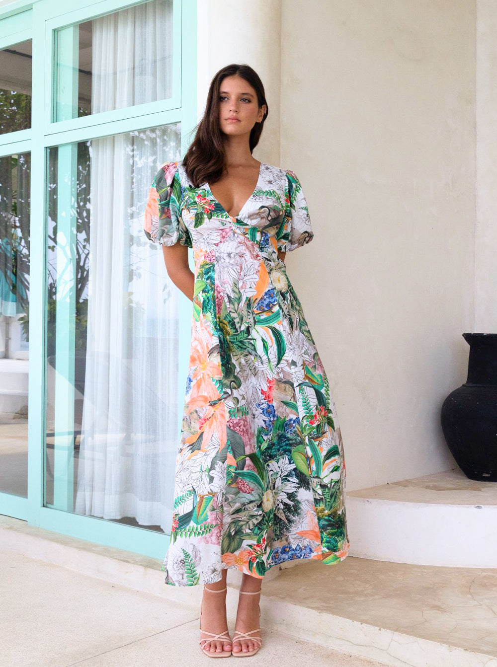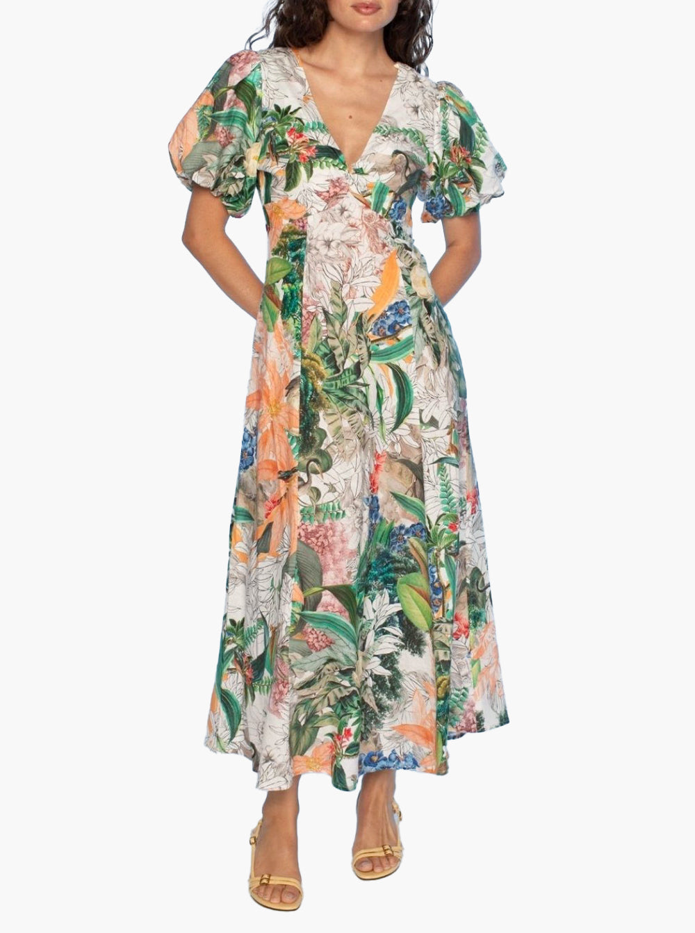 Short puff sleeves add a touch of charm, while the greenery print makes it truly unforgettable.