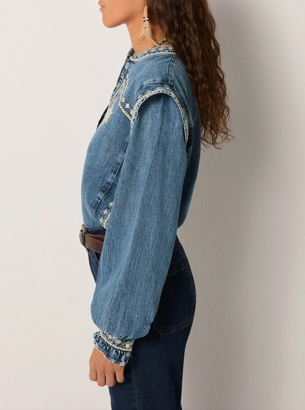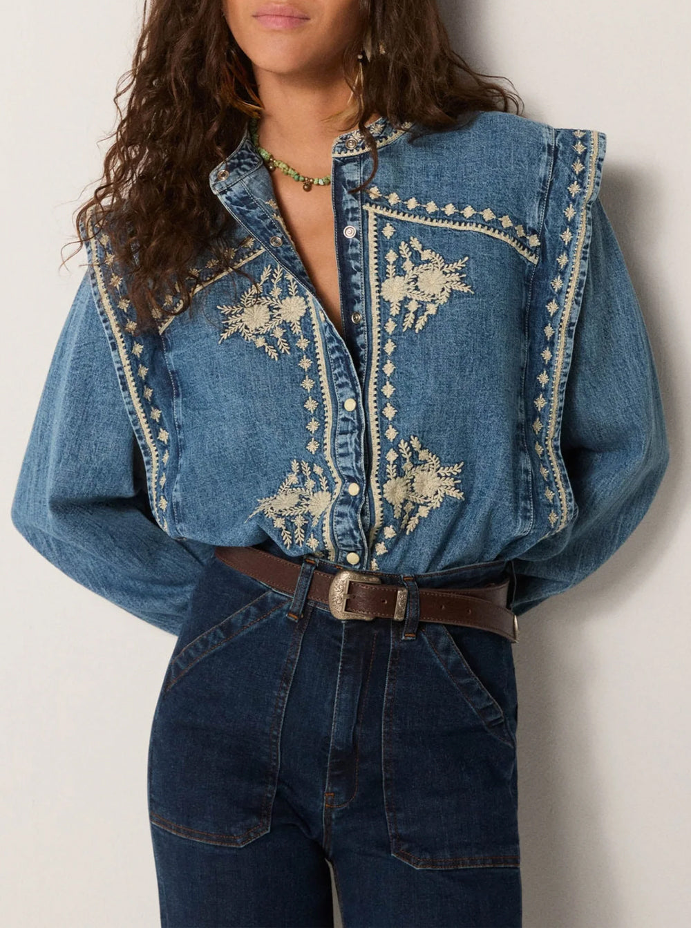 Cotton denim washed to structure yet softened by wear, carrying the quiet strength of workwear. Its surface feels steady, the faded blue closer to summer skies than indigo ink. Across chest and sleeves, ivory florals unfurl like stitched gardens, adding delicacy to the rugged ground. The embroidery lightens the denim, lending movement and intricacy to a fabric built for endurance.