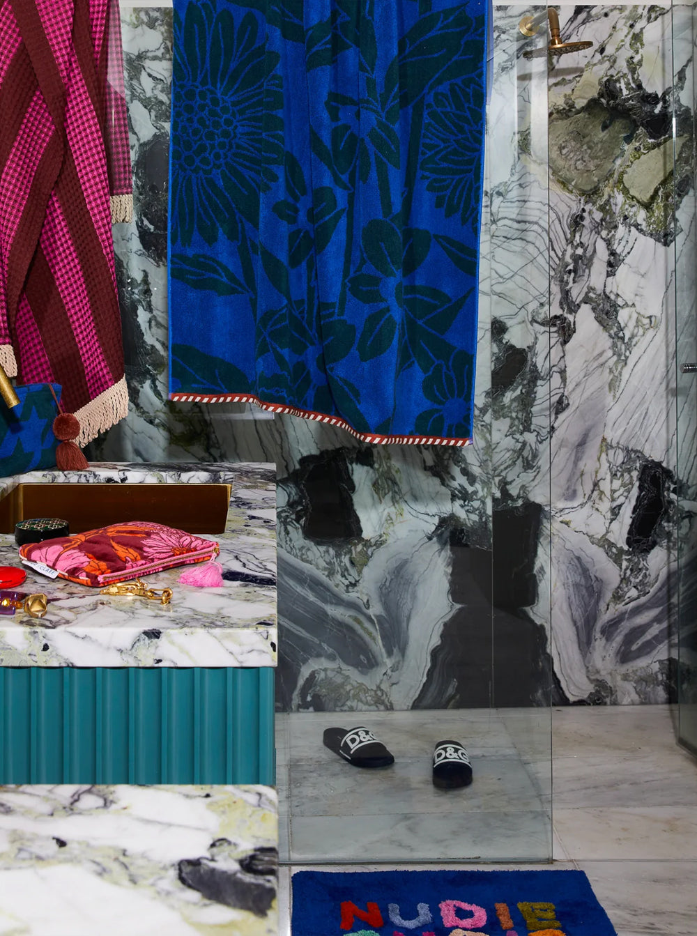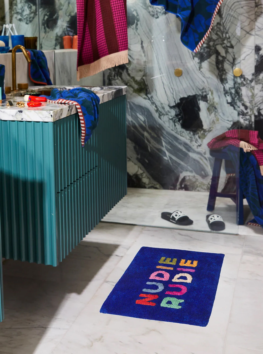 “Multiple fresh and rich colours lend an extra-uplifting feel to our cheeky and iconic Nudie Rudie slogan. This practical and playful mini design is made to bring a smile to your face every time you step out of the shower.” – Phoebe’s Style Notes