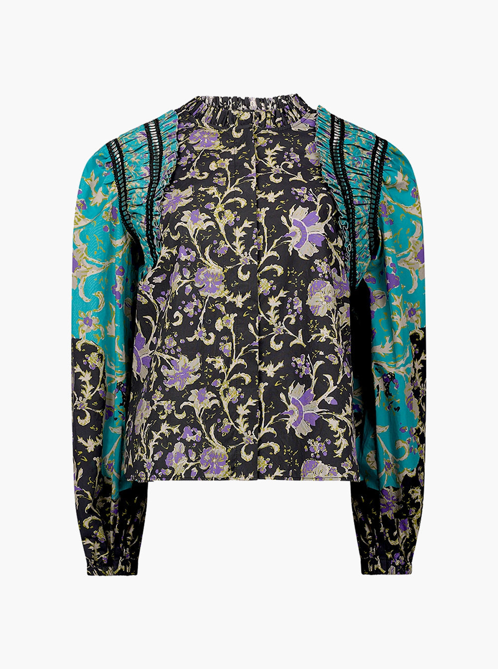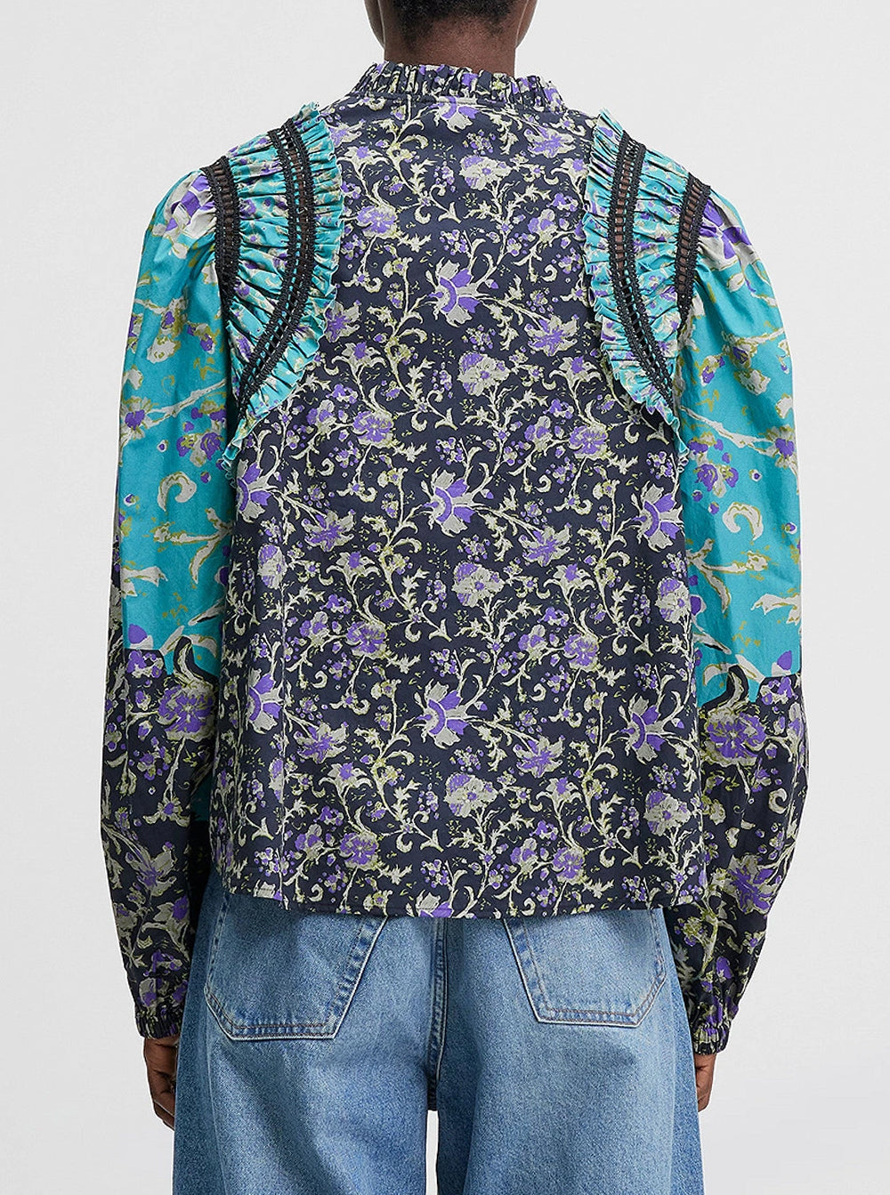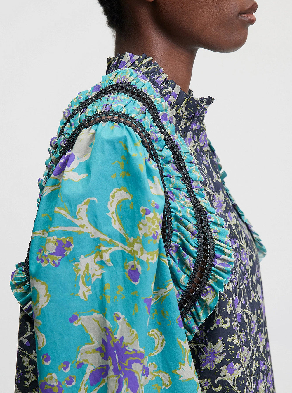 Regular price $199.00Discover Mes Demoiselles' cotton blouse with a black and turquoise floral print, a piece that exudes freshness. Its straight cut offers an elegant and versatile silhouette.