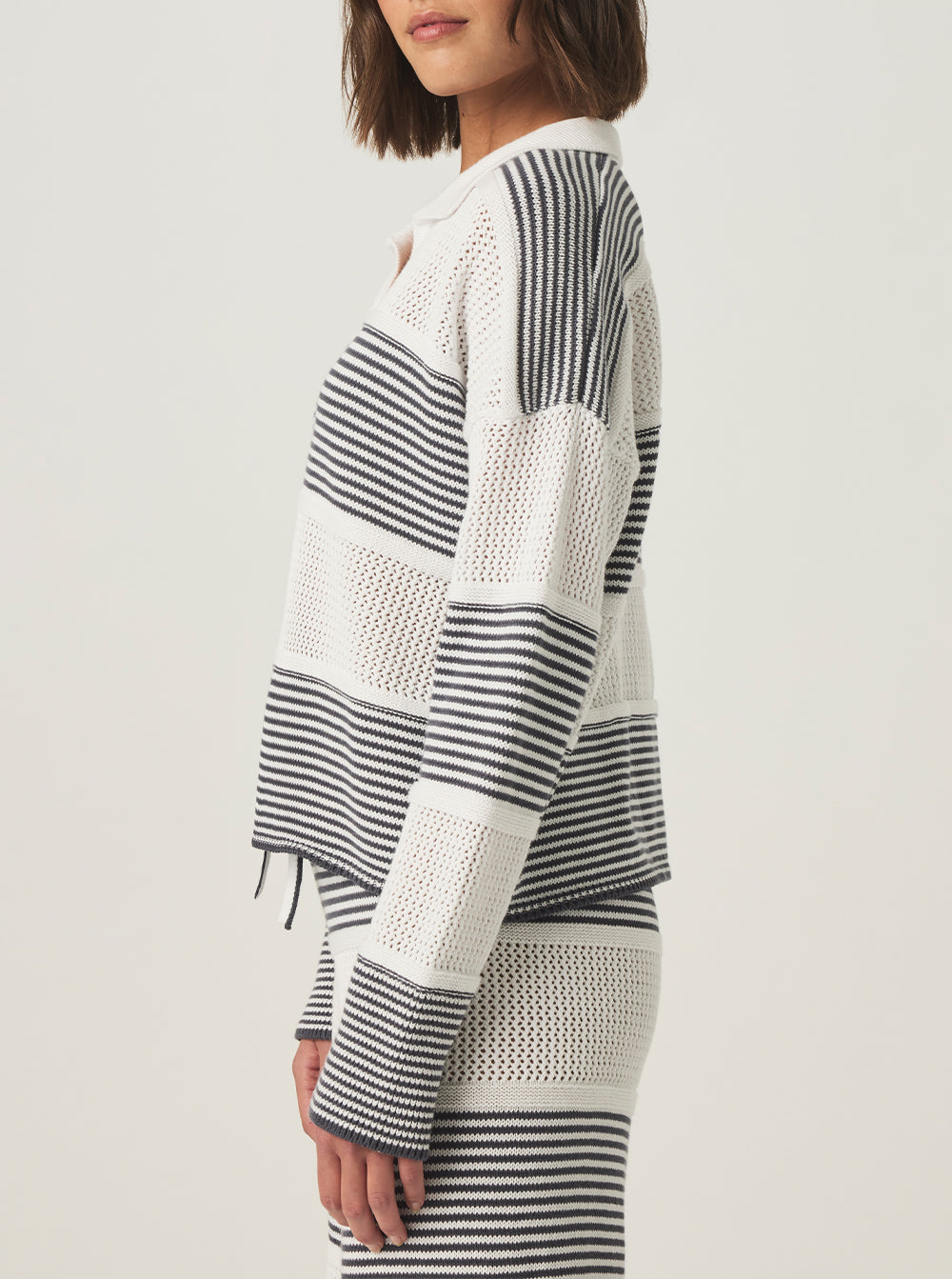 Crafted with a breathable open mesh stitch and bold placed stripes, this standout layer combines sporty sophistication with everyday ease. A full needle rib collar and placket add refined texture, while the polo collar and slash neckline lend a modern, athletic edge.