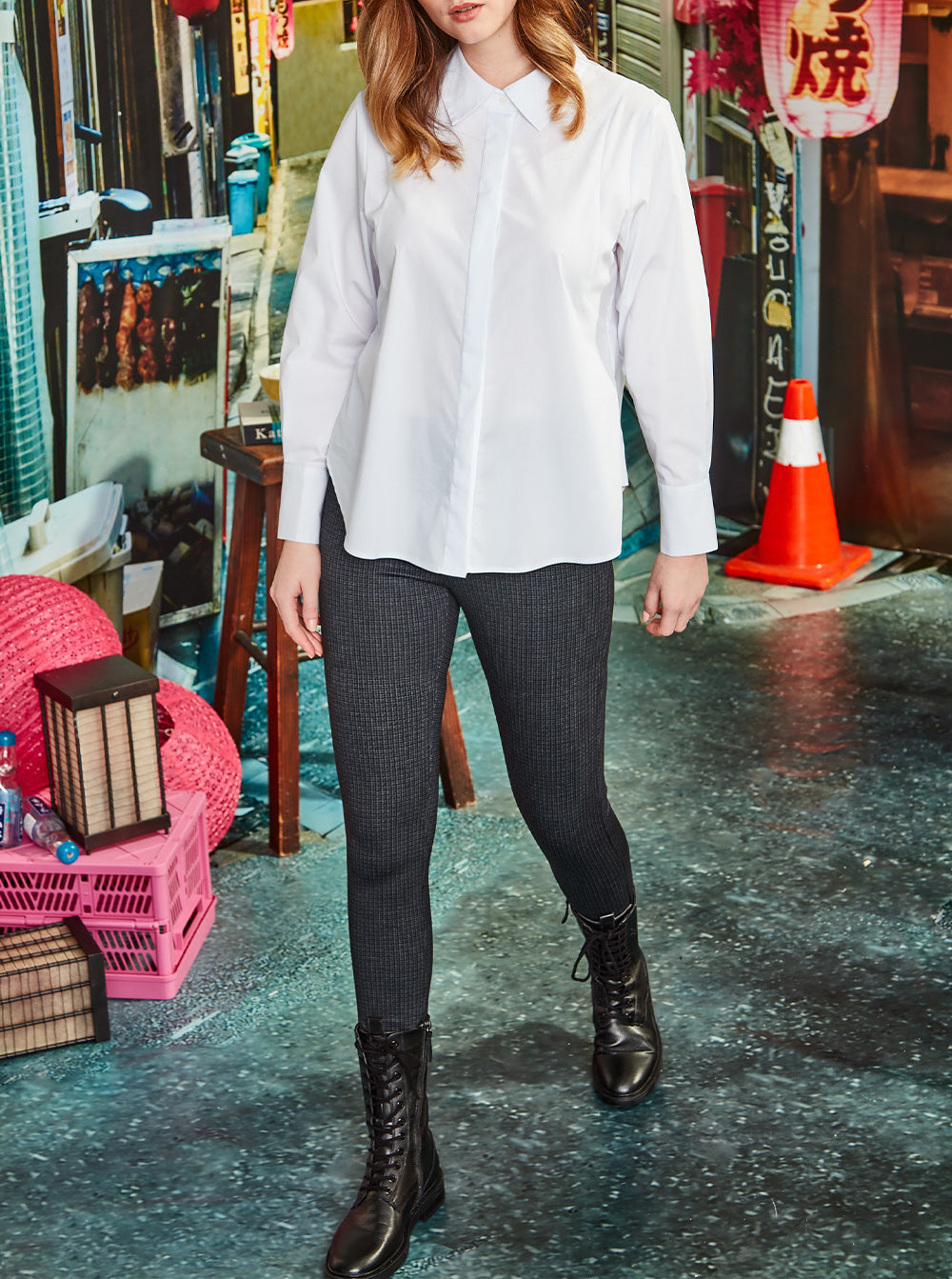 Versatile mini check Ponti pant with deep Basque waist for comfort. Slim leg pull on pants are the ultimate in comfort for cooler Winter days.