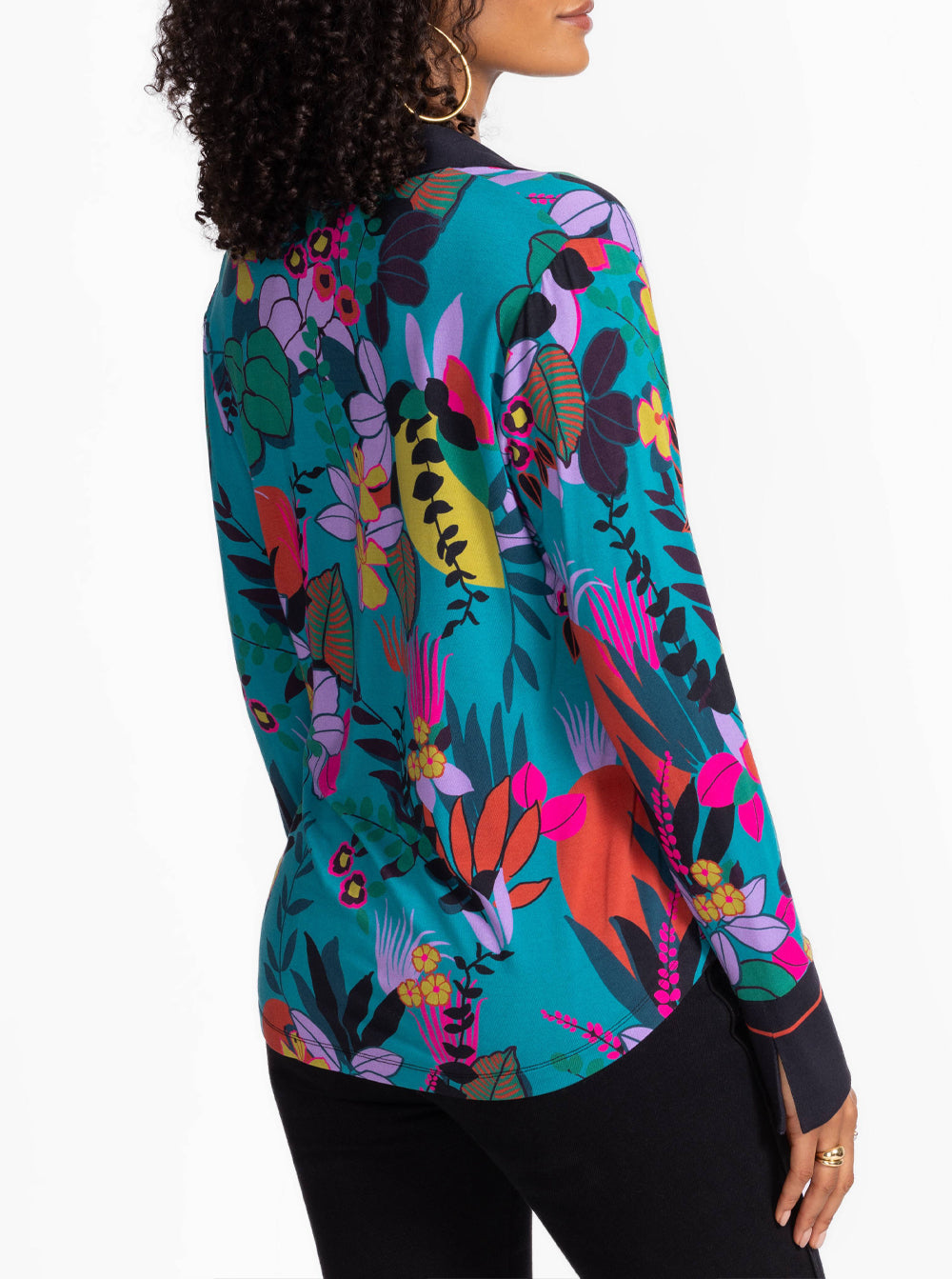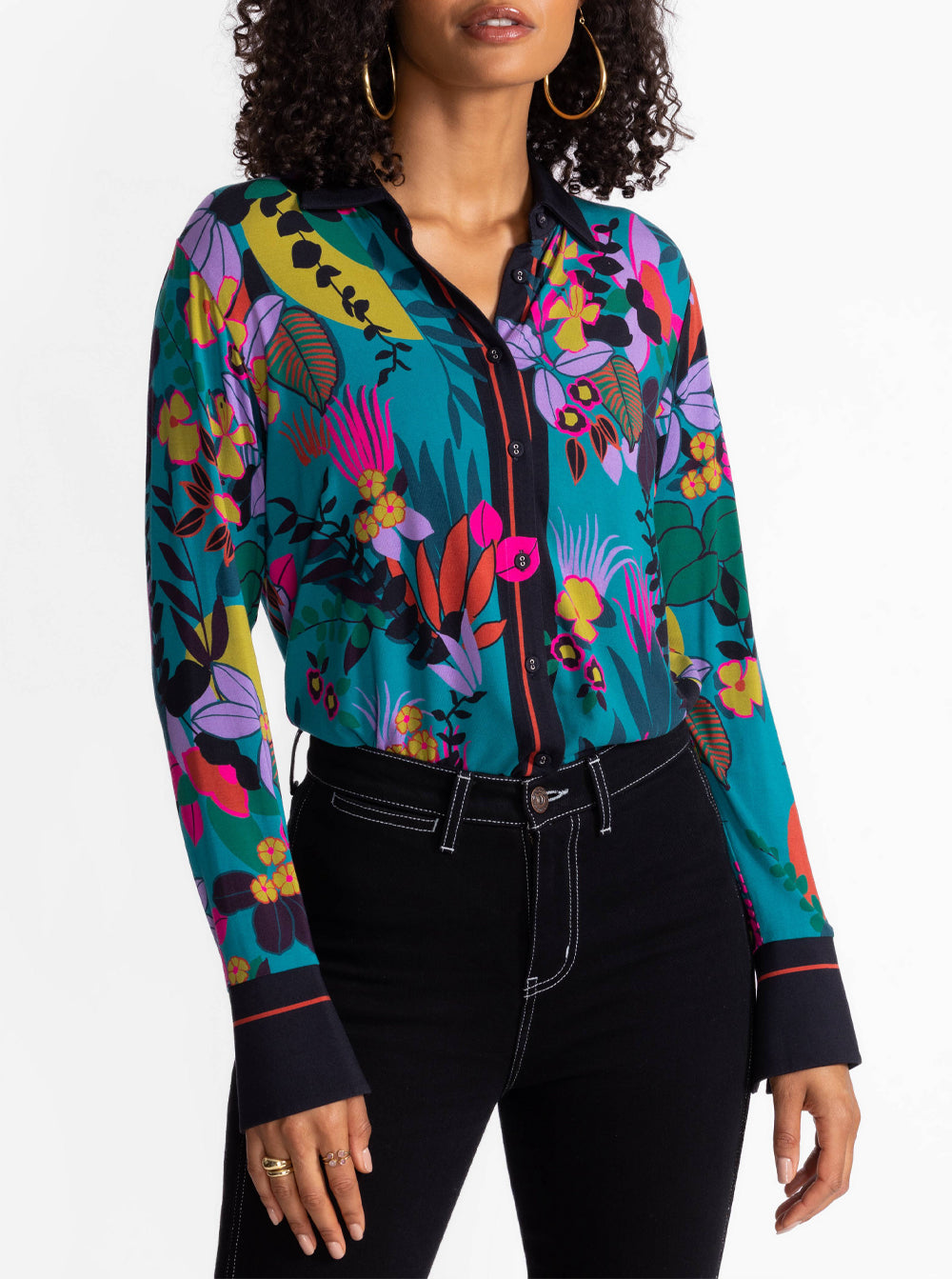 Embellished with bold floral images on a vibrant backdrop, the Janie Favorite Button Front Shirt is an eye-catching wardrobe addition.